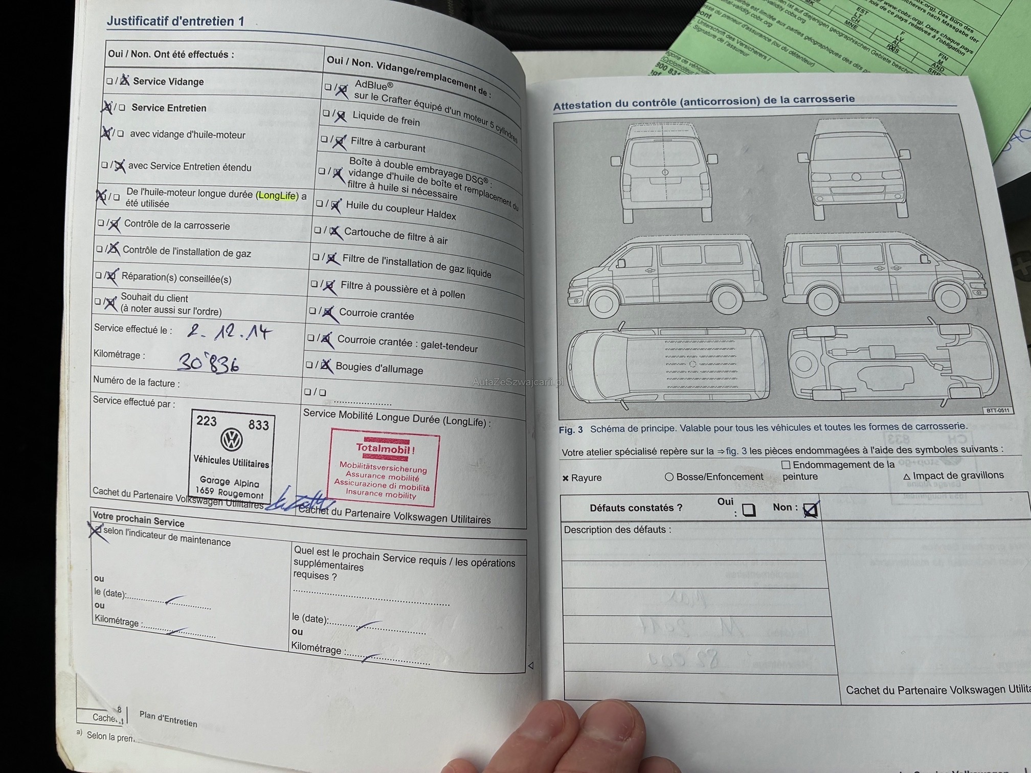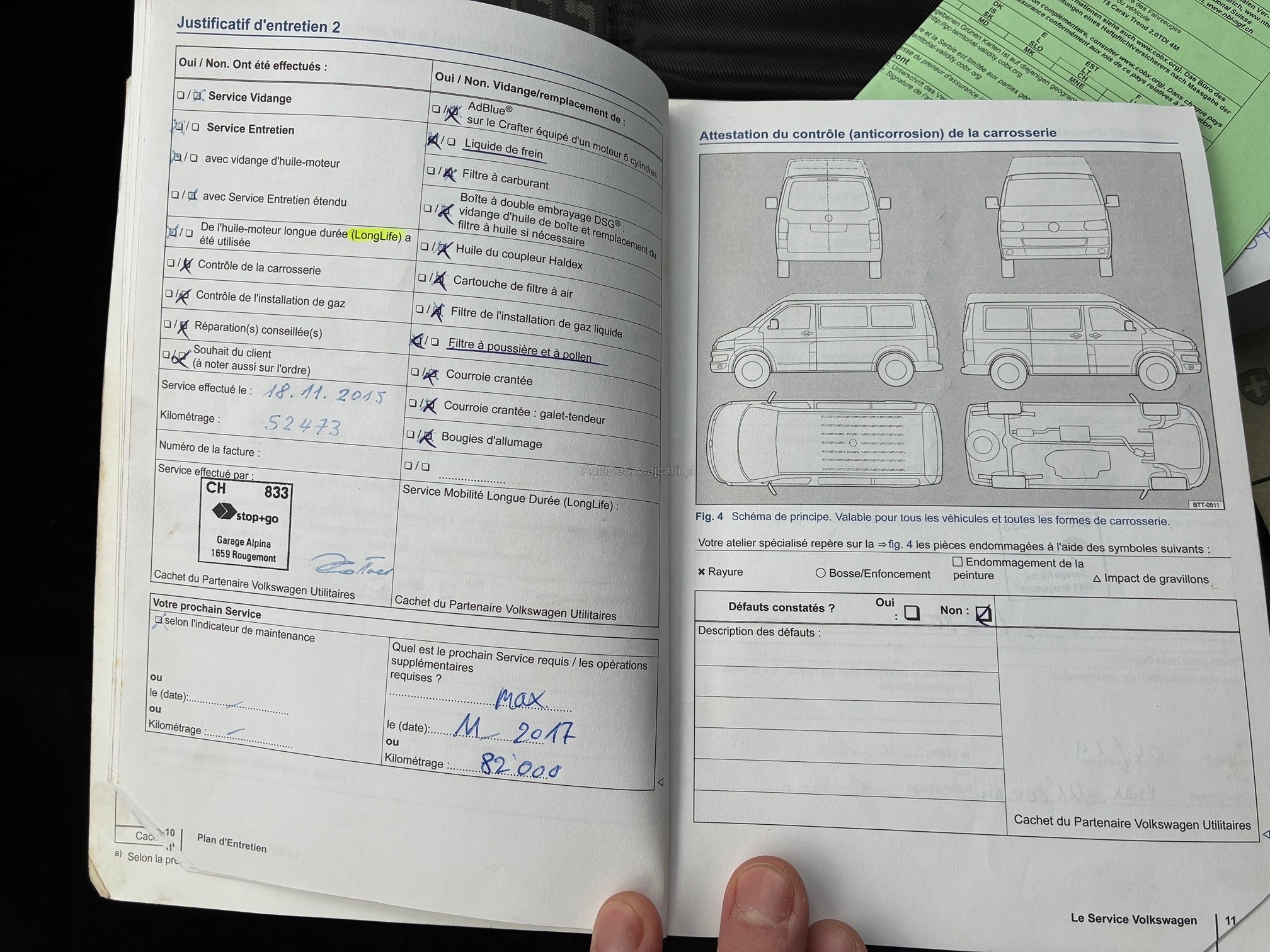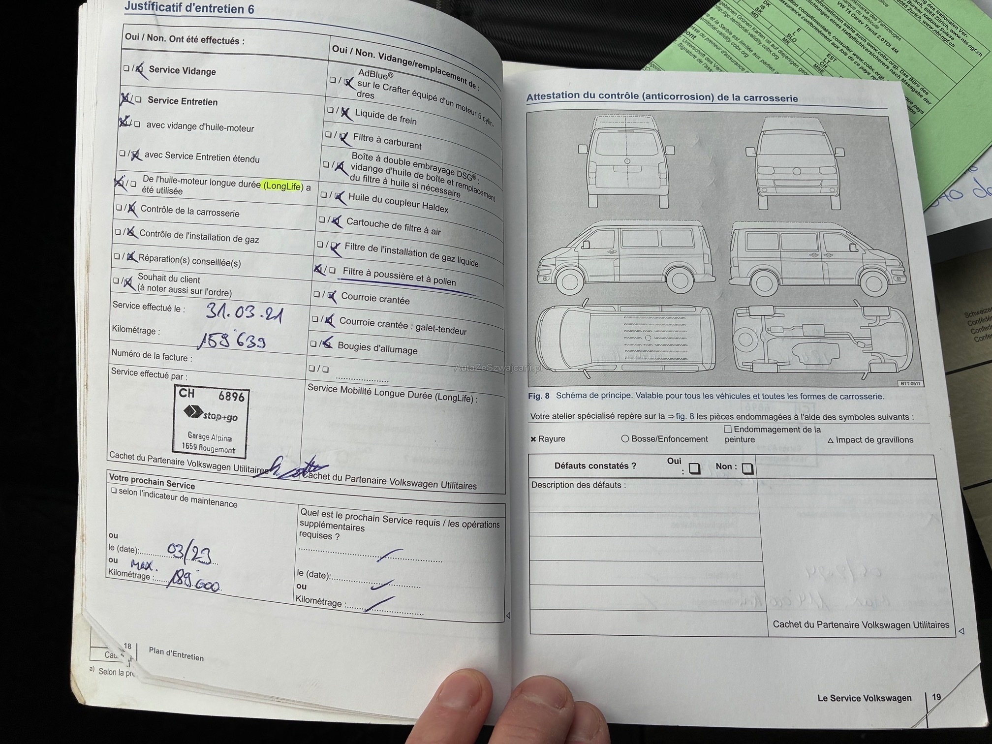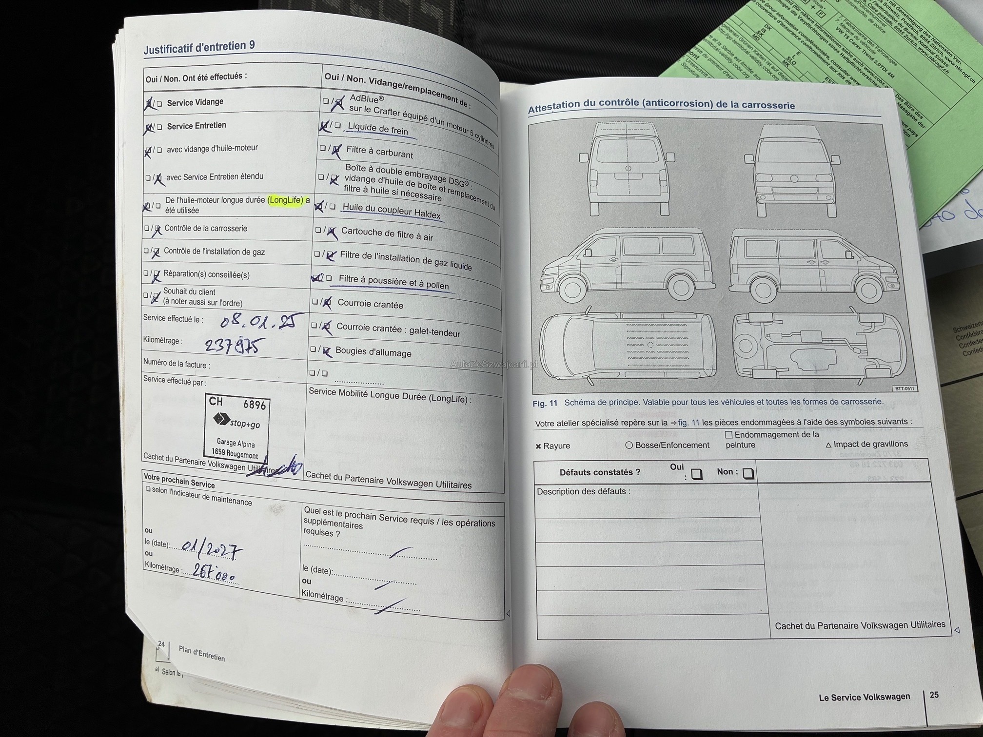 | Kommentar | Fahrzeug war kürzlich bei uns im Service. Dabei wurden folgende Arbeiten ausgeführt: - Inspektion mit Oelwechsel - Oel für Haldex-Kupplung und Dieselfilter ersetzt - DPF gemessen -> i.o (siehe Zertifikat) - Kardanwelle ersetzt Seit kurzem leuchtet zeitweise die Motorlampe. Gem. Fehlerspeicher funktioniert die Turboladerverstellung nicht ordnungsgemäss. Nach Neustart teils wieder i.o. Für definitive Problemlösung müsste der Turbolader ersetzt werden. Für anstehende MFK müsste sehrw. die Bremsen vorne ersetzt werden. Ansonsten steht einer erfolgreichen MFK nichts mehr im Wege. Es wurde keine abschliessende Beurteilung vorgenommen. - Lückenloses Serviceheft - Zahnriemen und Wasserpumpe wurde bei Km 208'000 (07.2023) ersetzt. - 3 Sitzreihe wurde demontiert - ist jedoch vorhanden und wird beim Verkauf montiert / mitgegeben |