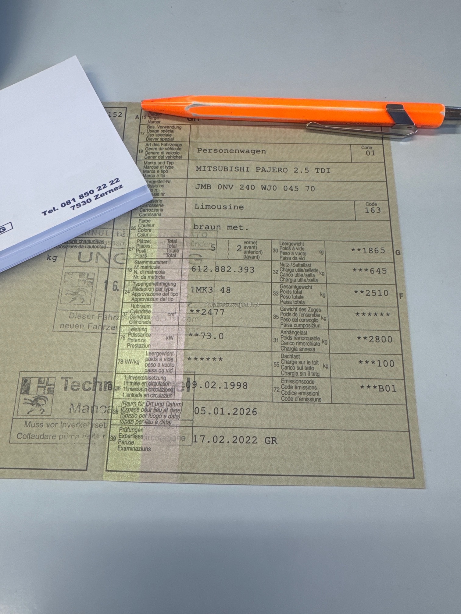 | Kommentar | MFK Mängel siehe Prüfbericht Für sichtbare sowie nicht sichtbare Mängel wird keinerlei Haftung übernommen! Jegliche Ansprüche auf Wandelung oder Minderung sind ausdrücklich ausgeschlossen! |