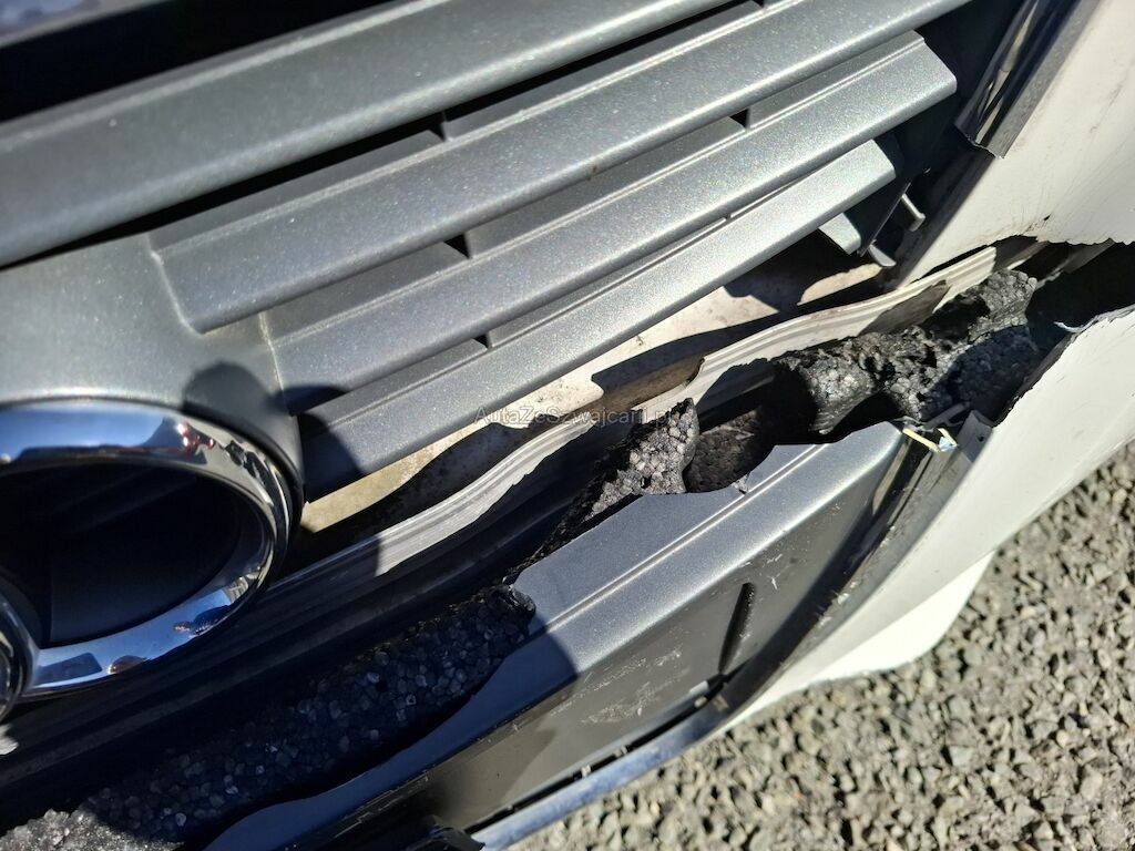 Dommage partie frontale: capot moteur aile gauche renfort de pare chocs pliés déformés emboutis enfoncés endommagés, phares gauche et droit enveloppe supports grilles et garnitures de pare chocs absorbeur de chocs calandre cassés fissurés éclatés arrachés endommagés.