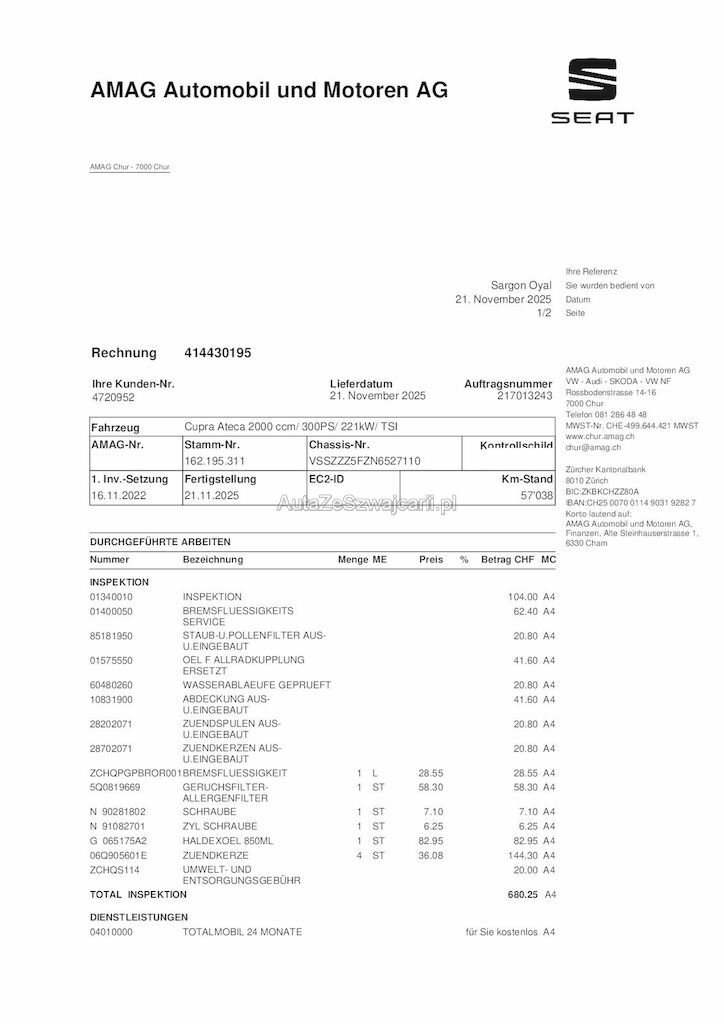| Information | mit Anschlussgarantie bis 04.2027 oder 100'000km letzter Service mit DSG und Haldex im 12.2025 erledigt |
