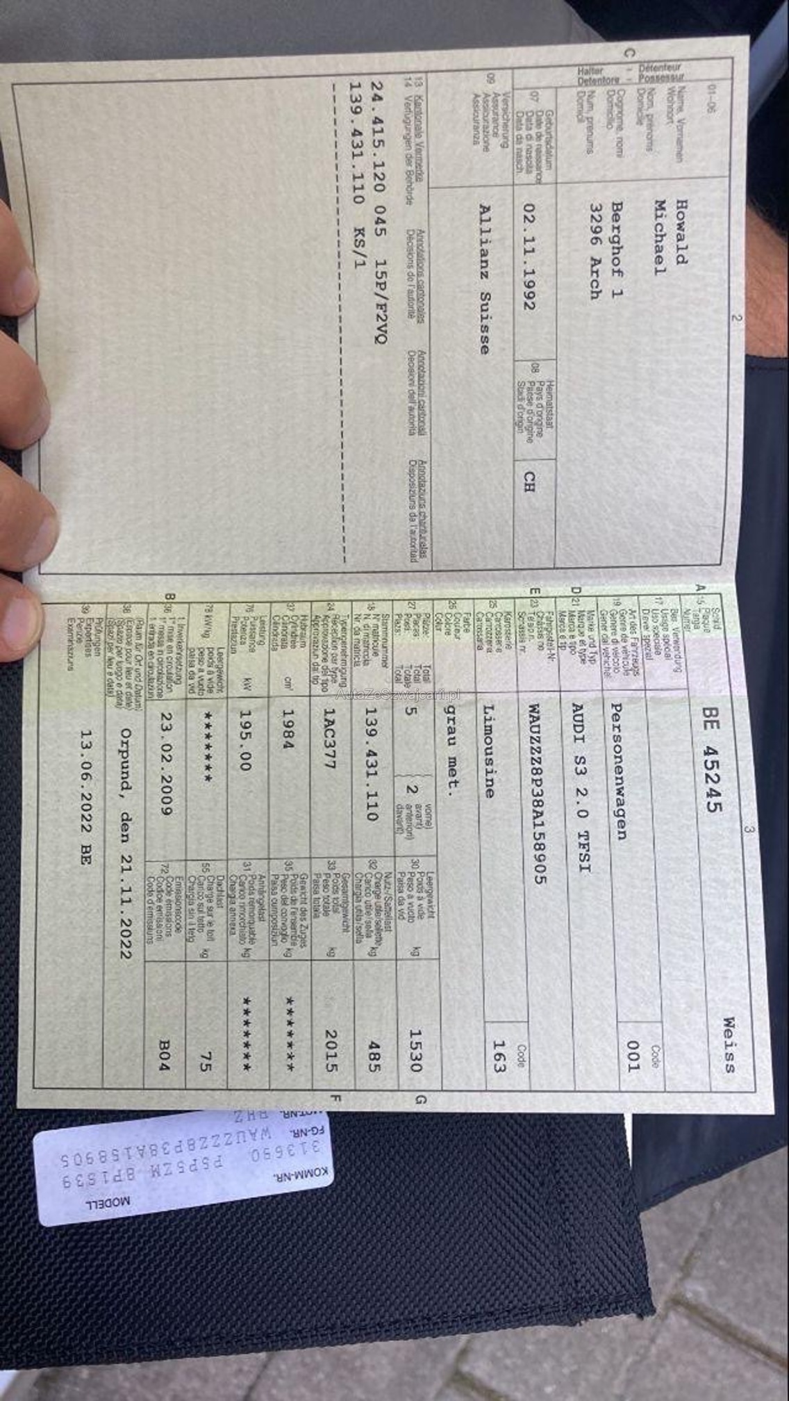 | Kommentar | Zum Verkauf steht ein Audi S3 in fahrbereitem Zustand. Bekannte Mängel: • Ölverlust • leichter Ölverlust an der Unterdruckpumpe • gemäss Bildern Rost vorhanden Zustand: • Zustand gemäss Bildern Wichtige Hinweise: • Fahrzeug ist fahrbar • Verkauf ab Platz, ohne Garantie • Fahrzeug muss innerhalb von fünf Arbeitstagen abgeholt werden • Danach fallen Standgebühren von CHF 20.– pro Tag an |
