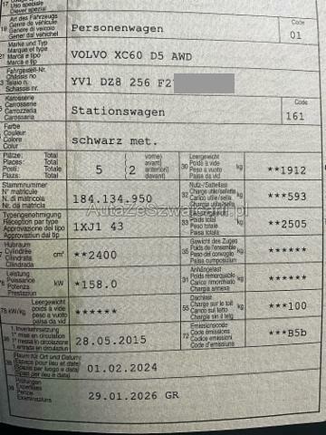 | Condition_and_Equipment | Demontage Persönliche Gegenstände oder Ladegut im Fahrzeug werden entfernt. Zustand Fahrzeug muss transportiert werden (Höhe und Breite beachten). Fahrzeug ist NICHT fahrbar. Fahrzeug ist rollbar. --- Links Linke Seite beschädigt. Rechts Rechte Seite beschädigt. Front Front eingedrückt. Frontblech/Maskenblech eingedrückt. Innenraum Raucher-Fahrzeug Sonstige Schäden Div.Carrosserie Teile sind leicht beschädigt. Lackierung matt (stumpf, beschädigt). --- Serienaustattung Klimaautomat Airbag Fahrer und Beifahrerseite Elektronische Wegfahrsperre Elektrische Fensterheber vorne + hinten Aussenspiegel elektrisch verstellbar und heizbar Tempomat Bordcomputer Zentralverriegelung mit Fernbedienung Höhenverstellbare Vordersitze Innenspiegel automatisch abblendbar Lenkrad verstellbar SIPS Kopf-/ Schulterairbag Regensensor ABS und EBV Elektr. Bremskraftverteilung Reifendruck-Kontrollsystem RDK Lederschalthebel Antibeschlagssensor Bremsassistent EBA Isofix-Vorbereitung Rücksitze aussen Park-Distanz-Sensor hinten Mittelarmlehne vorne mit Staufach 2 Make-up-Spiegel beleuchtet Aussenspiegel elektrisch anklappbar inkl. Bodenleuchten Laderaumrollo DSTC Fahrdynamikregelung IDIS Fahrerinformationssystem WHIPS Schleudertrauma-Schutzsystem Mittelarmlehne h mit Getränkehalter/ Staufach Getränkehalter in Tunnelkonsole Multifunktions-Lederlenkrad Dachreling silber SIPS Seitenairbag Fahrer und Beifahrerseite Colorverglasung Dieselpartikelfilter Hill Descent Control HDC Elektrisch verstellbarer Fahrersitz mit Memory Automatische Parkbremse Aktivkohlefilter mit automatischer Umluftschaltung Gepäckraumschutz Rücksitzbank im Verhältnis 40/20/40 Luftraumheizer elektrisch/ Schnellenteisung LED Tagfahrlicht Komfortsitze mit Lederbezug Dekorausstattung Aluminium Shimmer Graphite Keine Gewähr auf die Angaben der Serienausstattungen Leichtmetallräder 18" Pan Digitale Instrumentierung Lendenwirbelstützen elektr. für Vordersitze Audiosystem Sensus High Performance Sound VSP Volvo Swiss Premium Sonderausstattung Metallic-/ Perleffekt-Lackierung Leichtmetallräder 20" Cratus |