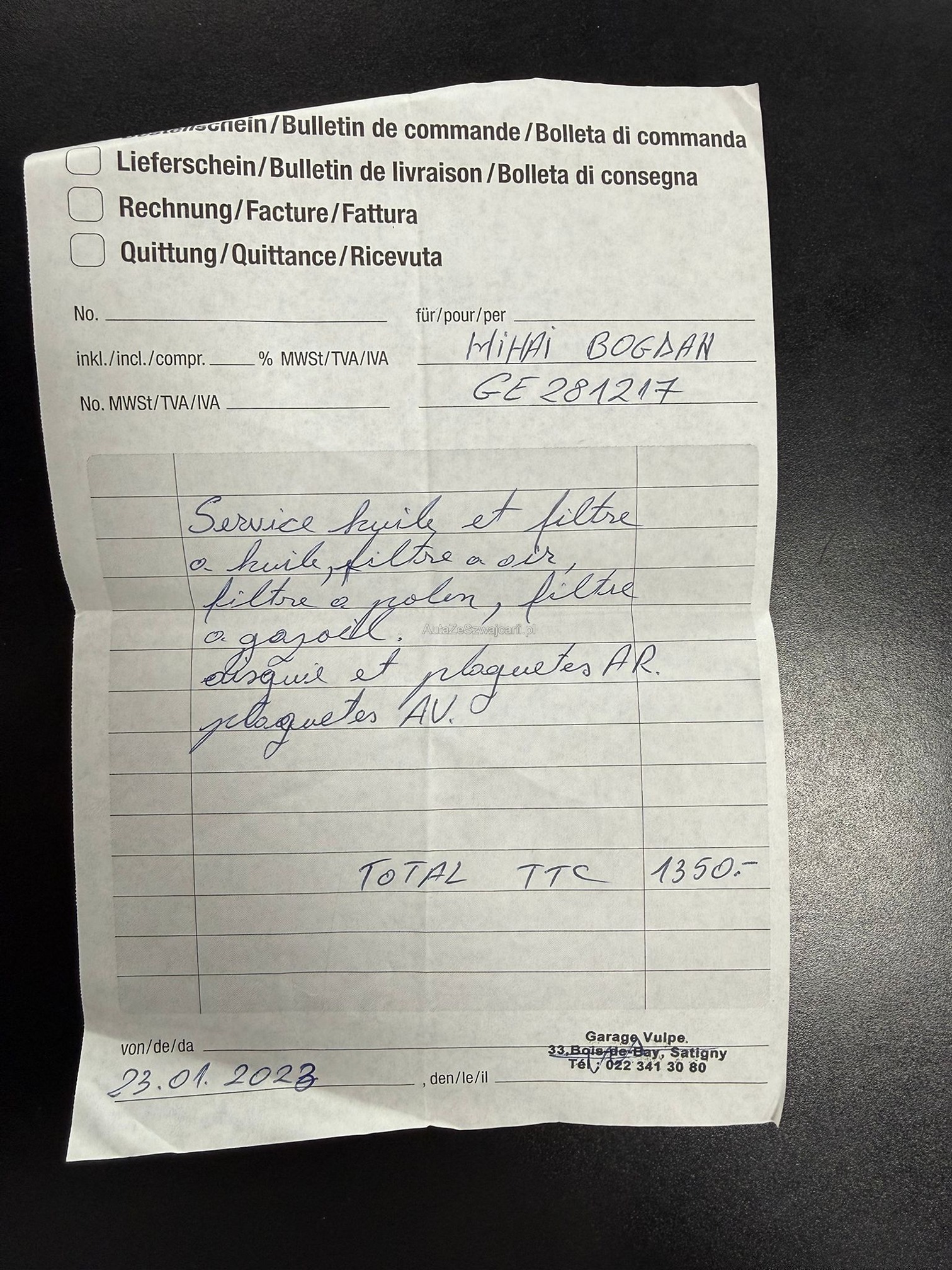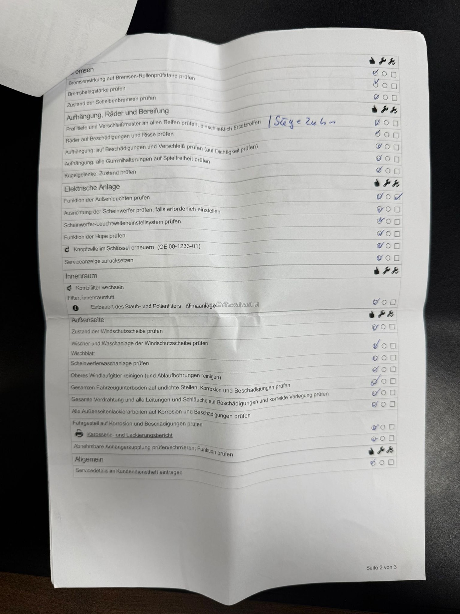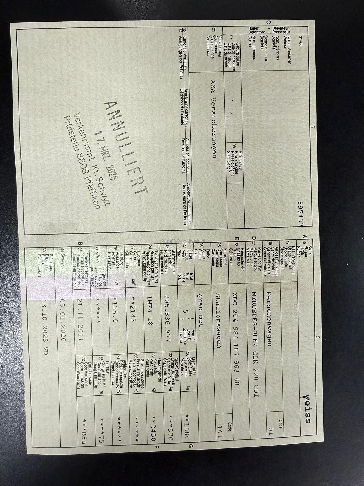 | Kommentar | Verkauf erfolgt ab Platz und ohne Garantie, insbesondere Wandelung und Minderung ausgeschlossen! Bei diesem Fahrzeug haben wir keinen Eintauschtest durchgeführt! DPF i.O. Automat und Motor funktionieren einwandfrei, bei der kurzen Probefahrt ist uns nichts aufgefallen. Beim fahren hört man ein Poltergeräusch von hinten evtl. Stossdämpfer. Service fällig, Carrosserie und Lack gemäss Bilder rundum beschädigt und verkratzt. |