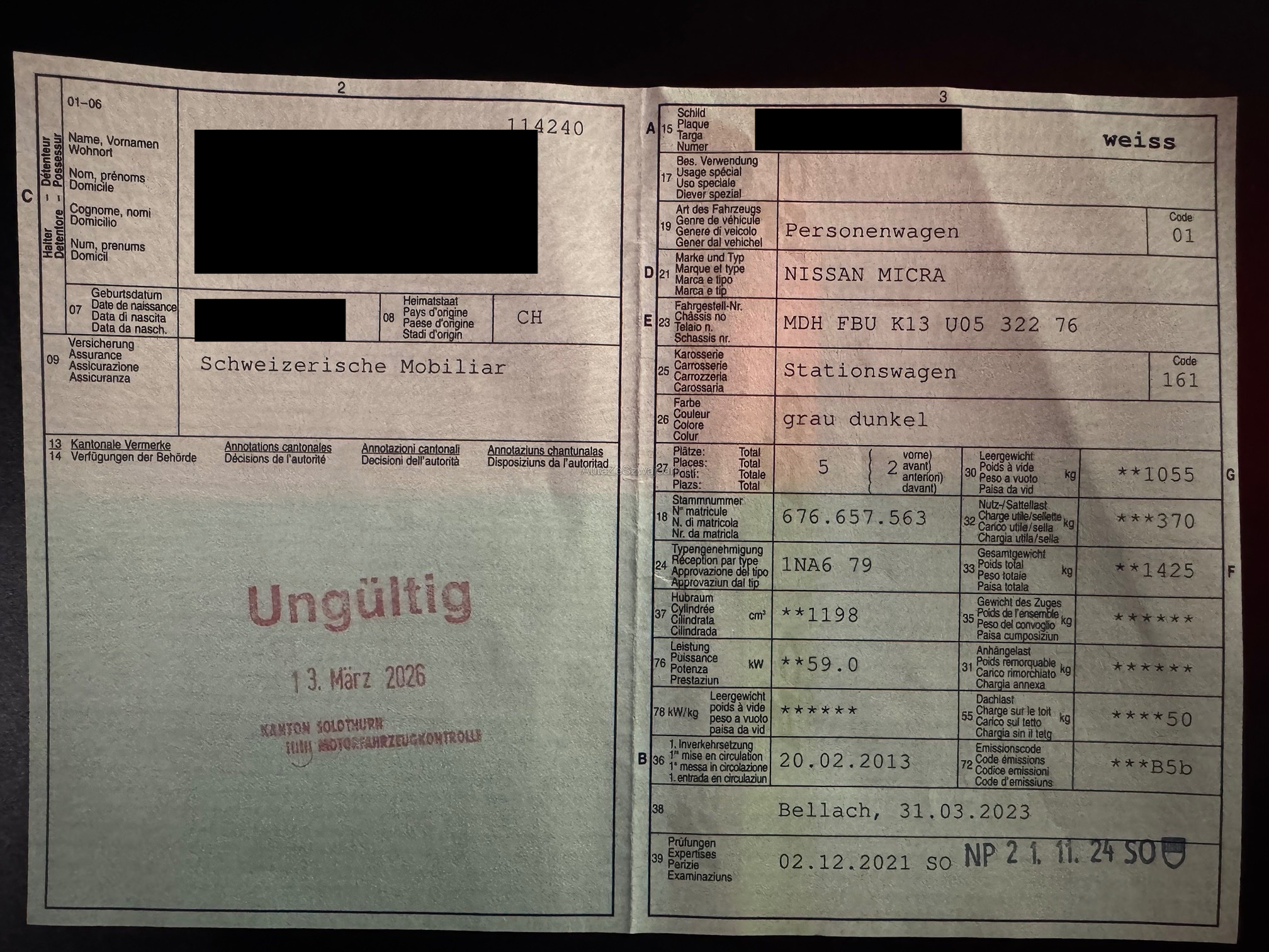 | Kommentar | Kein Werkstatttest vorhanden. Fahrzeug ab Platz und ohne Garantie. |