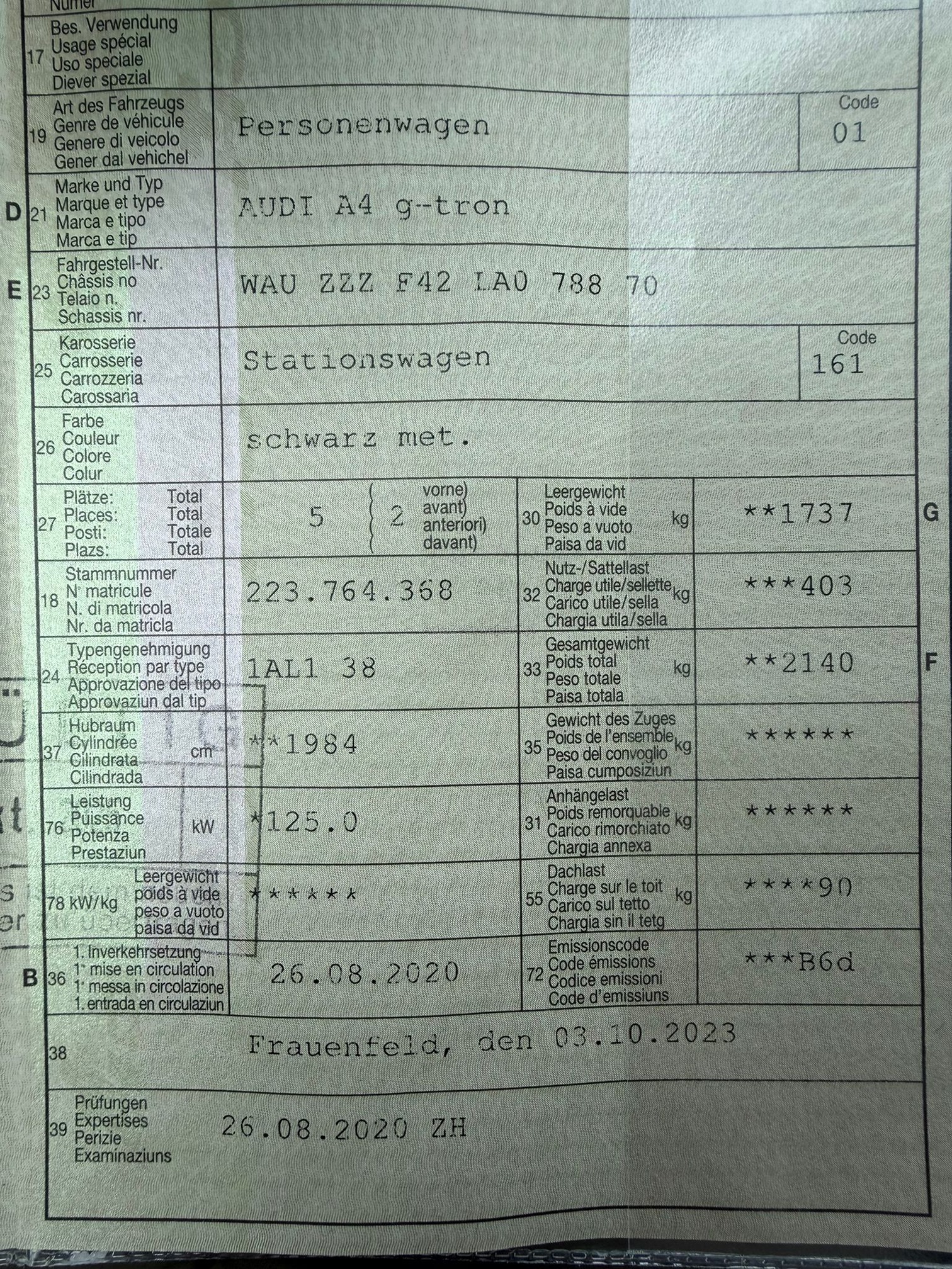 | Kommentar | Professionelle Folierung in Grau. Originalfarbe Schwarz. Frisch ab grossem Service. Beiblatt für Felgen fehlt. Treibstoff Gas und Benzin. |
