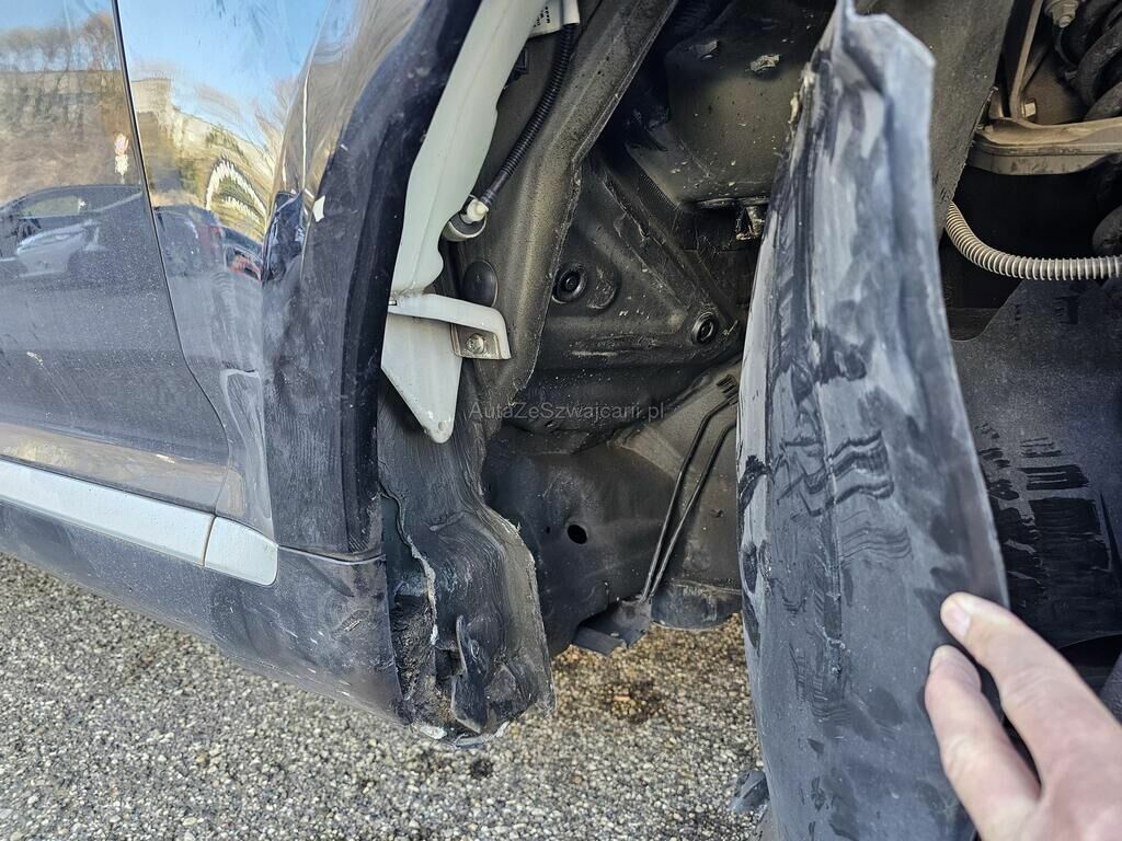 Choc latéral avant droit : pare-chocs et support latéral, aile et cuvelage, moulure d'aile, passage de roue, bas-de-caisse, roue, demi-train, transmission, direction berceau.