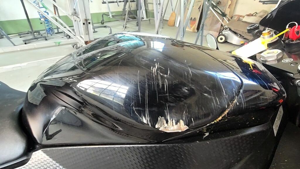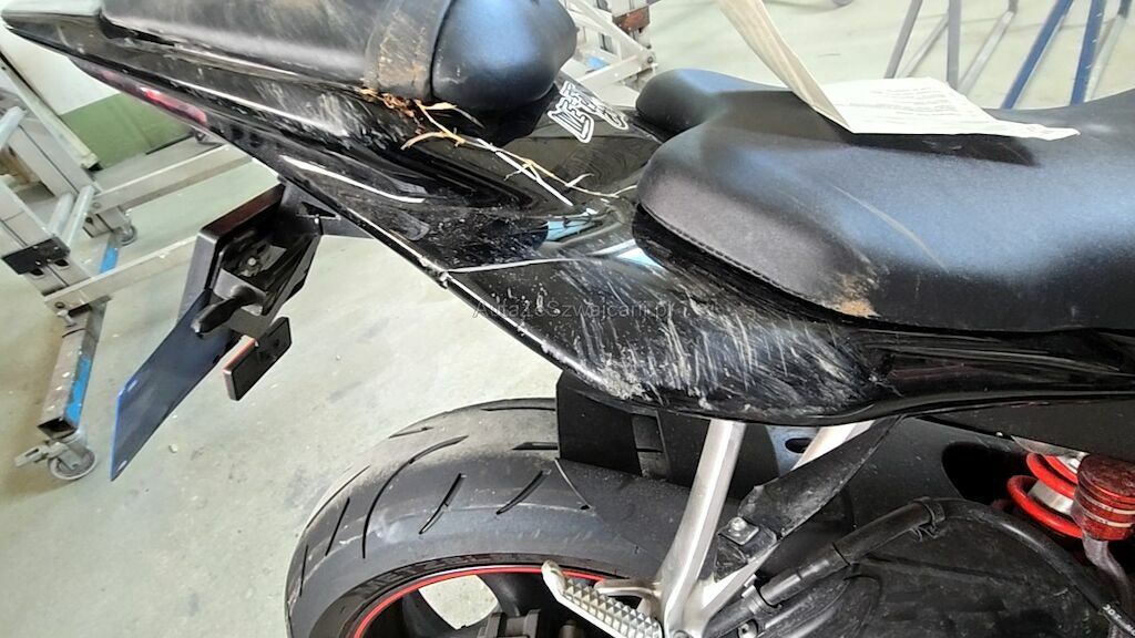 Rechte Seite zerkratzt, Diverse Verschalungen, Bremshebel, Blinker, Lenkergriff rechts, Gashebel, Lenker mit Lager, Fussrasten, Auspuff, Sitze, Scheinwerfer, Getriebedeckel, Tank Scheinwerfer, Rahmen, usw. zerkratzt und gerissen.