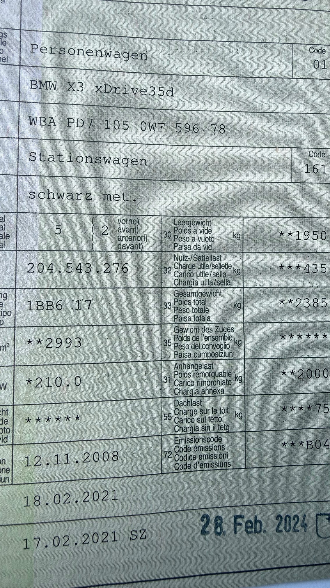 | Kommentar | Licht hinten rechts innen defekt, Dachhimmel Dachfenster defekt ( Führung ), Fensterheber hinten links defekt. Fahrzeug in Betrieb, keine Lampen leuchten, ( ausser wegen Lampe HR ), keine weitere technische Prüfung gemacht M PD71 X3 3.0sd 76200.00 P 0475 BLACK SAPPHIRE METALLIC 1010.00 F LUD3 LEDER NEVADA/D3 SATTELBRAUN 3270.00 S 01CA SELEKTION COP RELEVANTER FAHRZEUGE 0.00 S 01CB CO2 UMFANG 0.00 S 0205 AUTOMATIC GETRIEBE 0.00 S 0216 SERVOTRONIC 380.00 S 0225 SERIENFAHRWERK 0.00 S 0249 MULTIFUNKTION FUER LENKRAD 0.00 S 02ML M LM RAEDER DOPPELSP. 192 M MISCHB. 0.00 S 02PA RADSCHRAUBENSICHERUNG 0.00 S 0302 ALARMANLAGE 690.00 S 0320 MODELLSCHRIFTZUG ENTFALL 0.00 S 0337 M SPORTPAKET 4510.00 S 0386 DACHRELING 350.00 S 0402 PANORAMA GLASDACH 2170.00 S 0413 GEPAECKRAUMTRENNETZ 0.00 S 0423 FUSSMATTEN IN VELOURS 0.00 S 0428 WARNDREIECK 0.00 S 0430 INNEN- UND AUSSENSPIEGELPAKET 200.00 S 0431 INNENSPIEGEL,AUTOMATISCH ABBLENDEND 0.00 S 0459 SITZVERSTELLUNG, ELEKTR.MIT MEMORY 1880.00 S 0464 SKISACK 0.00 S 0473 ARMAUFLAGE VORN 0.00 S 0481 SPORTSITZE FUER FAHRER/BEIFAHRER 0.00 S 0493 ABLAGENPAKET 0.00 S 0494 SITZHEIZUNG FUER FAHRER/BEIFAHRER 0.00 S 04AS EDELHOLZAUSF. PAPPEL MASER GRAU 660.00 S 0502 SCHEINWERFER-WASCHANLAGE 0.00 S 0508 PARK DISTANCE CONTROL (PDC) 0.00 S 0521 REGENSENSOR 0.00 S 0522 XENON-LICHT 1420.00 S 0524 ADAPTIVES KURVENLICHT 680.00 S 0534 KLIMAAUTOMATIK 0.00 S 0548 KILOMETERTACHO 0.00 S 0563 LICHTPAKET 360.00 S 0609 NAVIGATIONSSYSTEM PROFESSIONAL 3160.00 S 0628 KOMMUNIKATIONSPAKET 1110.00 S 0644 HANDY VORB. MIT BLUETOOTH-SCHNITTS. 0.00 S 0672 CD WECHSLER 6-FACH 0.00 S 0677 HIFI SYSTEM PROFESSIONAL 1550.00 S 0710 M LEDERLENKRAD 0.00 S 0715 M AERODYNAMIKPAKET 0.00 S 0760 M HOCHGLANZ SHADOW LINE 0.00 S 0761 INDIVIDUAL SONNENSCHUTZVERGLASUNG 590.00 S 0775 M DACHHIMMEL ANTHRAZIT 0.00 S 07AY COMFORT PAKET I.V.M M SPORTPAKET 1800.00 S 0840 HOCHGESCHWINDIGKEITSABSTIMMUNG 0.00 S 0851 SPRACHVERSION DEUTSCH 0.00 S 0863 SERVICE KONTAKT-FLYER EUROPA 0.00 S 0879 DEUTSCH / BORDLITERATUR 0.00 S 0896 TAGFAHRLICHTSCHALTUNG 0.00 S 08SP COP STEUERUNG 0.00 S 0962 KENNZEICHENTRAEGER VORNE ENTFALL 0.00 Total Sonderausstattung 25790.00 Total Neupreis 101990.00 |