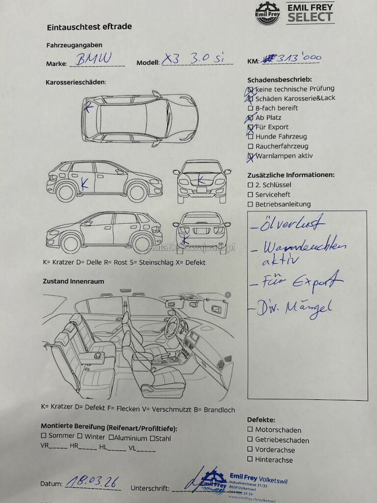 | Information | -Ölverlust -Beulen und Kratzer -Keine technische Prüfung (Werkstatttest) vorgenommen -Fahrzeug ab Platz, ohne Garantie und Aufbereitung. -Fahrzeug ist für Export -Es leuchten Warnlampen während des Betriebs. -Diverse Schäden an Karosserie/Lack. |