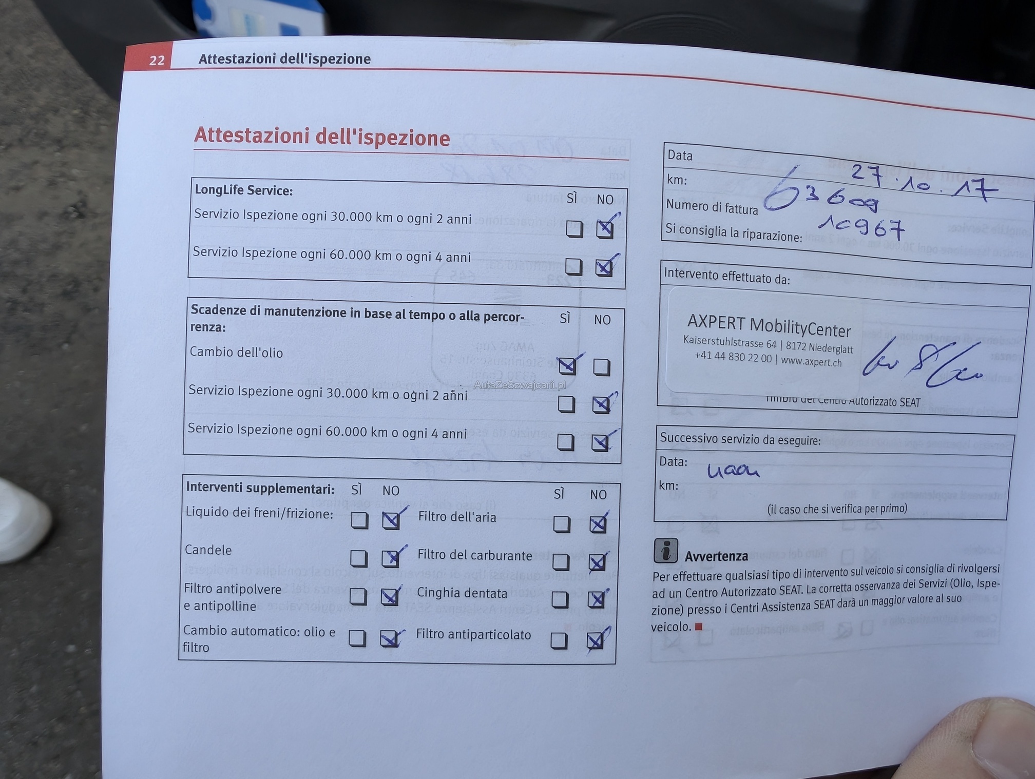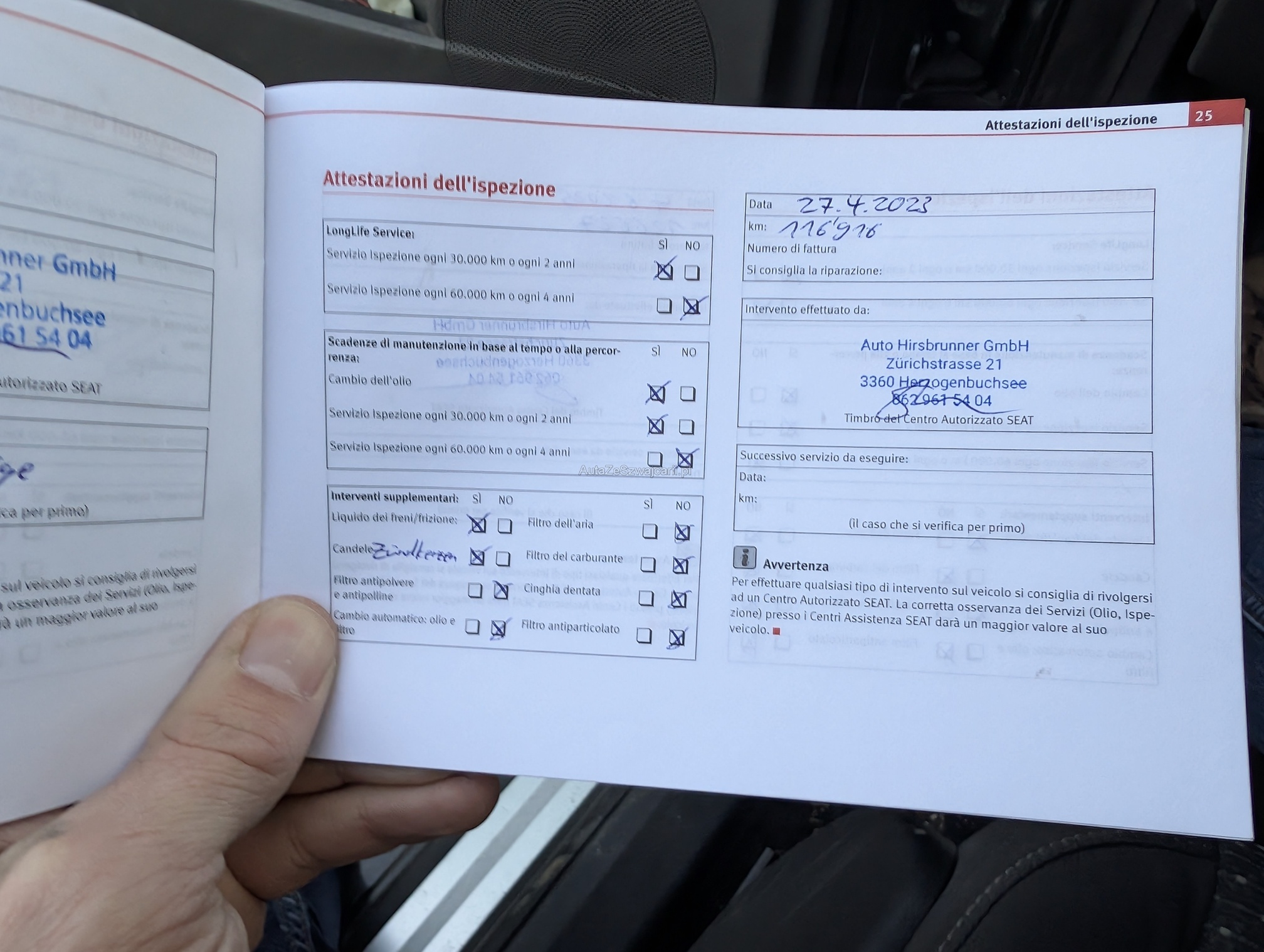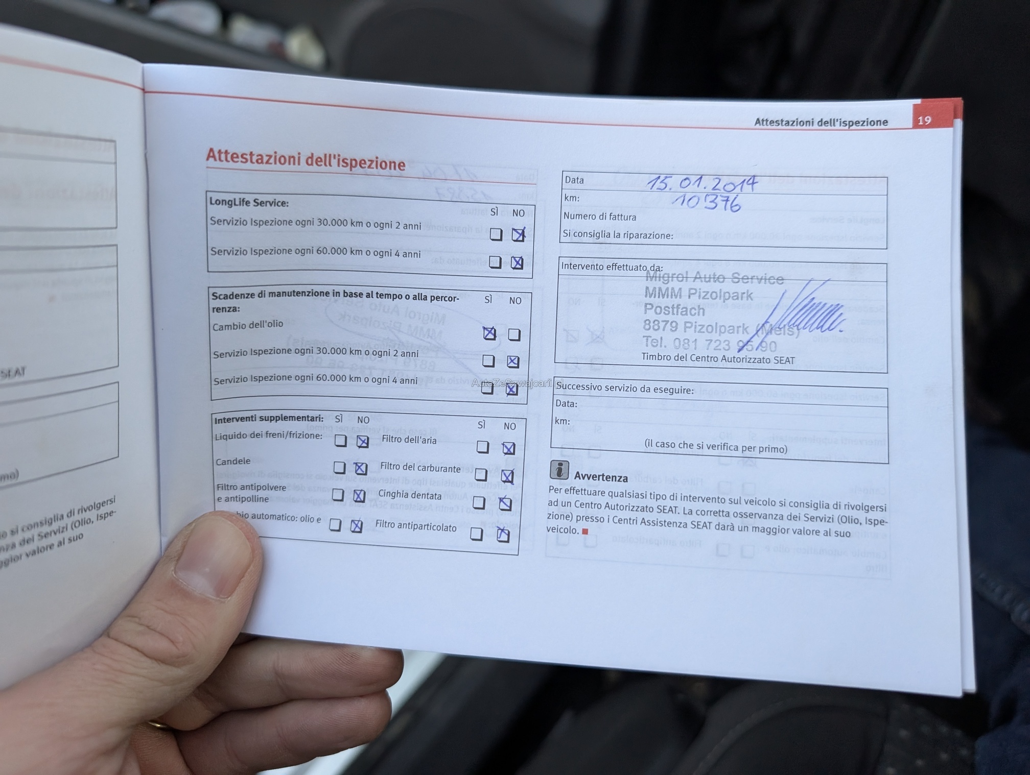 | Kommentar | Keine Eintauschkontrolle vorgenommen. Fahrertüre hat vertikale Dellen, auf Fotos schwierig sichtbar. Beifahrerseite diiverse Kratzer, siehe Fotos. Gemäss Aussage des Kunden braucht der Motor etwas Oel. Er konnte aber über die Menge keine Auskunft geben. Keine Garantie, keine gesetzliche Gewährleistung. Wandelungen und Minderungen ausgeschlossen. |