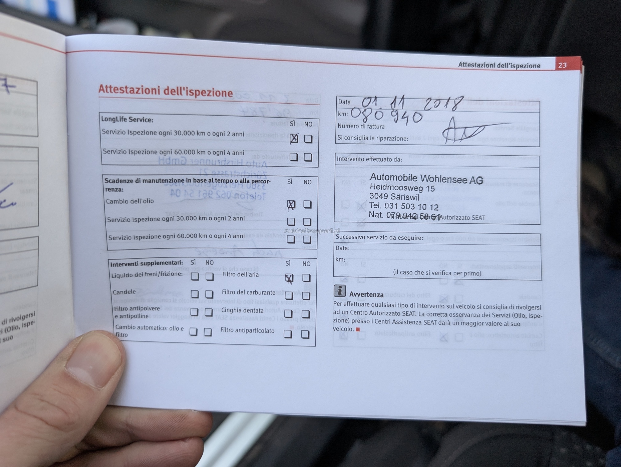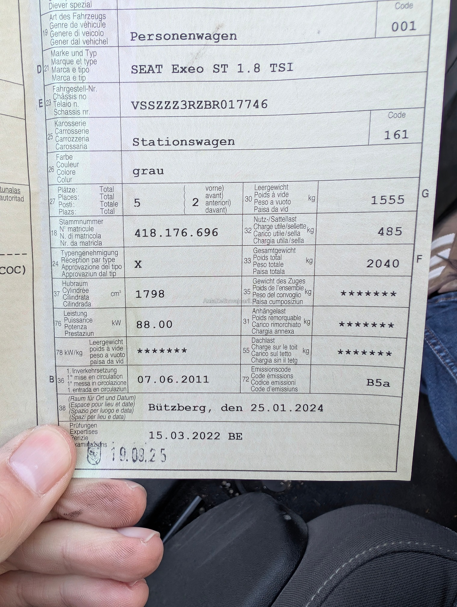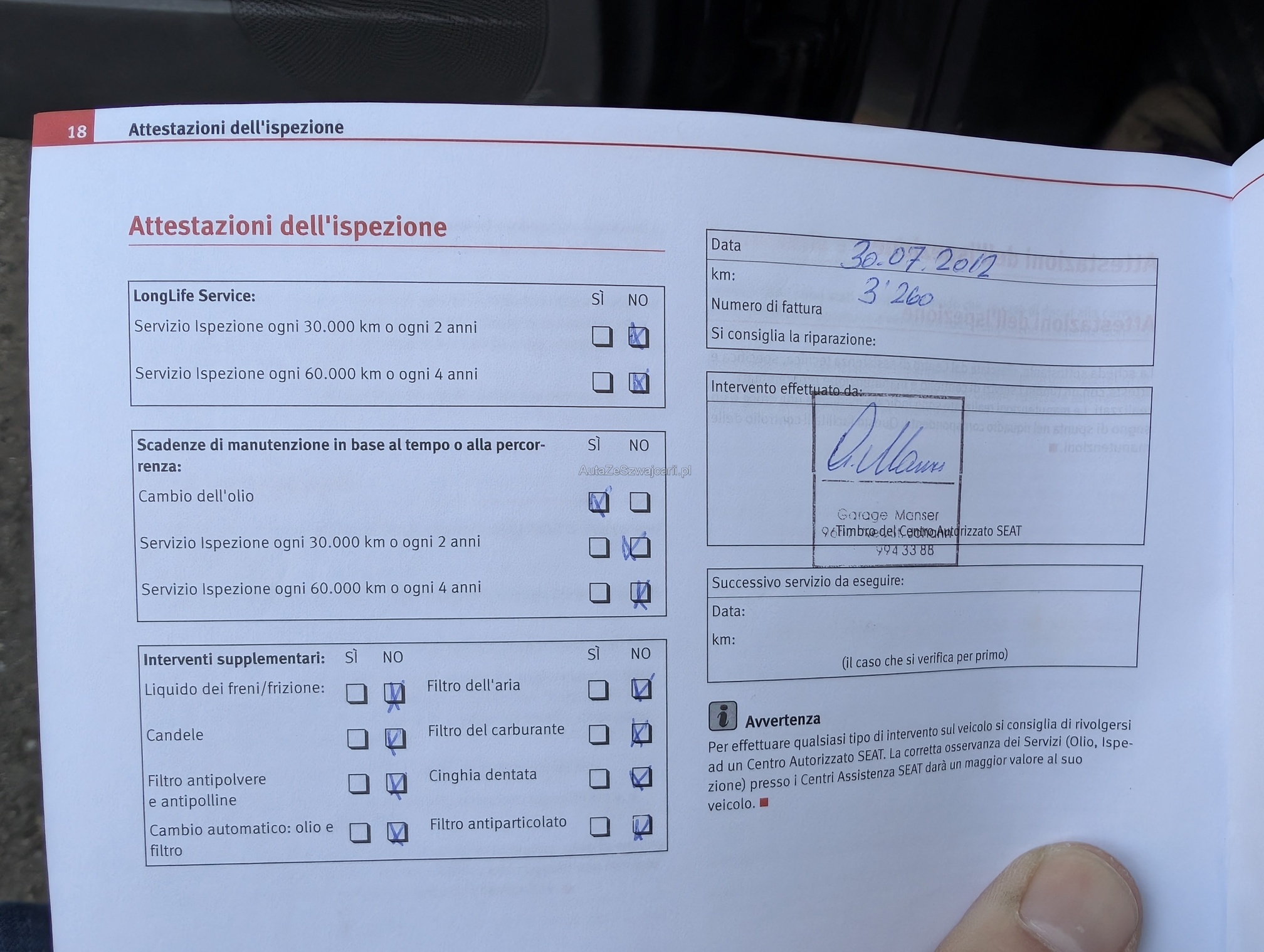 | Kommentar | Keine Eintauschkontrolle vorgenommen. Fahrertüre hat vertikale Dellen, auf Fotos schwierig sichtbar. Beifahrerseite diiverse Kratzer, siehe Fotos. Gemäss Aussage des Kunden braucht der Motor etwas Oel. Er konnte aber über die Menge keine Auskunft geben. Keine Garantie, keine gesetzliche Gewährleistung. Wandelungen und Minderungen ausgeschlossen. |