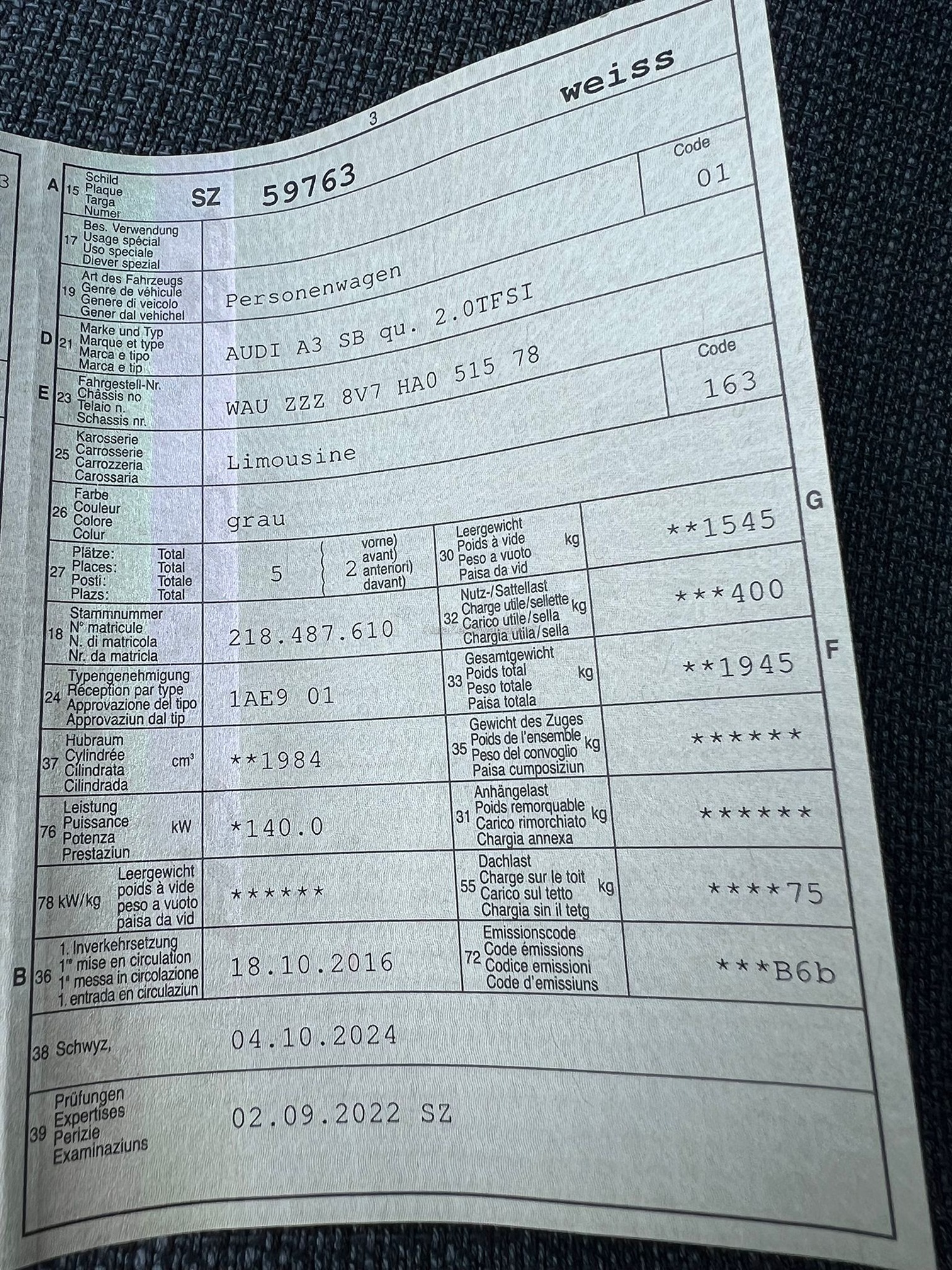 | Kommentar | Kein Werkstatttest durchgeführt, das Fahrzeug ist aber innen wie aussen sehr gepflegt! |