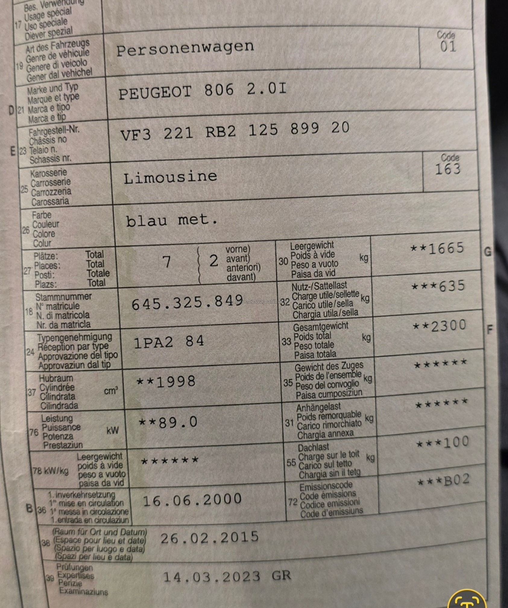 PEUGEOT 806 2.0I