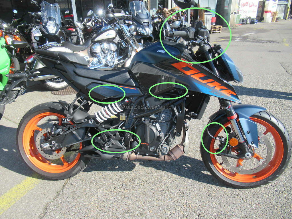 Lenker, Lampenträger, Tacho, Spiegel links und rechts verbogen, Felge deformiert, Tank deformiert,Fusstritt rechts, Verschallung rechts Kratzer