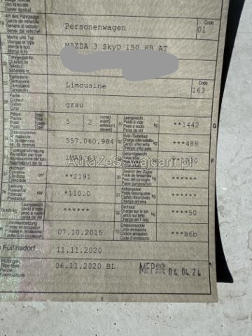 | Condition_and_Equipment | Demontage Persönliche Gegenstände oder Ladegut im Fahrzeug werden entfernt. Zustand Fahrzeug ist fahrbar. Sonstiges Fahrzeugdokumente vorhanden. Schlüssel Nur ein Schlüssel vorhanden. Weitere wichtige Hinweise Zum Zeitpunkt der Besichtigung wurden die Dichtungen der Einspritzdüsen ersetzt. --- Rechts Anstoss rechts im Bereich der C-Säule. Anstoss rechts im Bereich der D-Säule. Hagel Hagelschaden mittel. --- Serienaustattung Airbag Fahrer und Beifahrerseite Elektrische Fensterheber vorne + hinten Nebelscheinwerfer Innenspiegel automatisch abblendbar Multifunktionslenkrad Lederlenkrad mit Lederschaltknauf Aussenspiegel elektrisch verstellbar/ heizbar und anklappbar Bi-Xenon-Scheinwerfer Sound System Bose Dunkelgetönte Scheiben hinten Vorhangairbags vorne + hinten Zwei Zonen-Klimaautomatik Seitenairbags vorne Bluetooth Interface fürs Mobiltelefon Touchscreen-Farbbildschirm Heizbare Vordersitze Dieselpartikelfilter Isofix-Kindersitzbefestigung hinten Rücksitzlehnen getrennt abklappbar 60:40 Geschwindigkeitsautomatik Head-Up Display Keyless Entry System Licht- und Regensensor Berganfahrhilfe Einparkhilfe hinten DSC Dynamische Stabilitäts- und Traktionskontrolle TCS Stop + Start System Einparkhilfe vorne LED Tagfahrlicht LED Rückleuchten Spurwechselassistent Keine Gewähr auf die Angaben der Serienausstattungen Radio/ CD mit AUX und USB City Notbremsfunktion Sonderausstattung Metallic- oder Mica Lackierung |