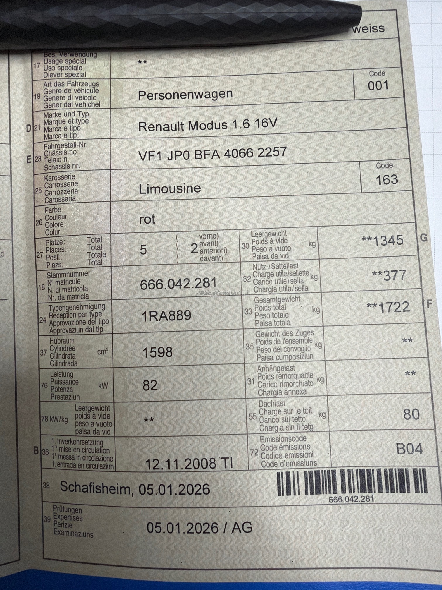 | Kommentar | Der Modus wurde am 05.01.2026 frisch vorgeführt (Bremsen hinten NEU, Querlenker NEU). Nun hat der Automat einen defekt und muss ersetzt werden. Wagen fährt nicht mehr vor und zurück. Service bald fällig meldet das Auto. Karrosserie hat dem alter entsprechende Gebrauchsspuren. Wir haben keinen Werkstatttest mehr durchgeführt. Abholung innert 3 Tagen nach Auktionsende. |