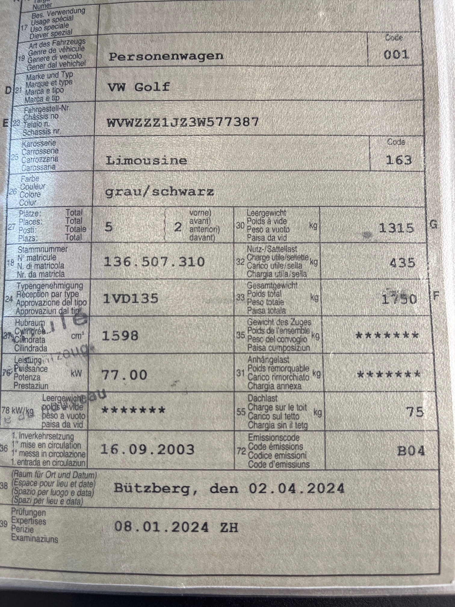 | Kommentar | Am Fahrzeug wurde kein Werkstatttest durchgeführt (für sichtbare oder nicht sichtbare Mängel wird keine Haftung übernommen). Verkauf ab Platz, ohne Garantie. Wandelung und Minderung sind ausgeschlossen. |
