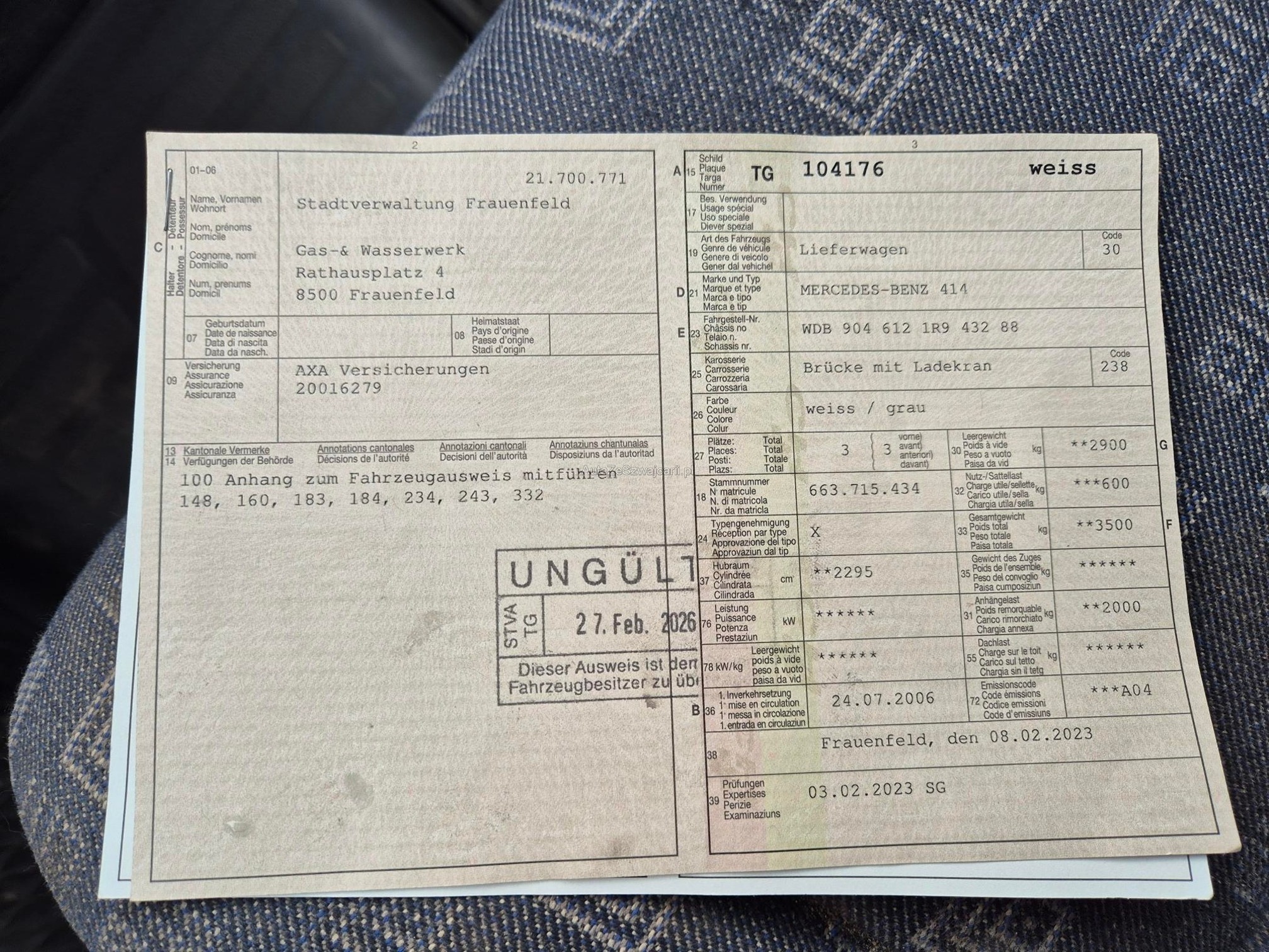 | Kommentar | Wagen muss aufgeladen werden da ein Kühlerschlauch ab ist und das Wasser läuft raus,Wagen hat Rost,Motor läuft aber normal. |