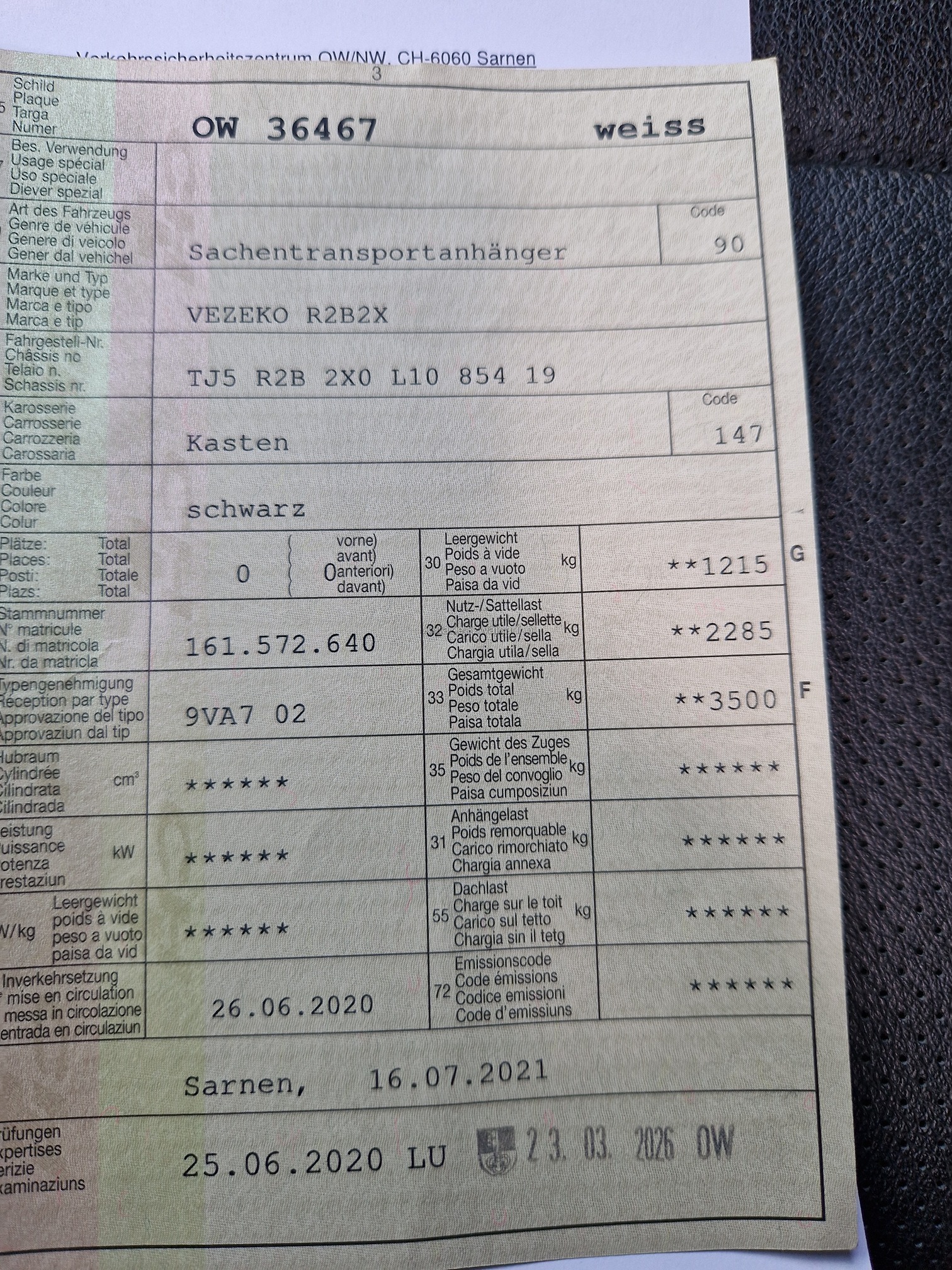 | Kommentar | Vezeko R2B2X Sachentransportanhänger Frisch ab Mfk Kratzer vorhanden in der schwarzen Folie Wird im Auftrag verkauft |