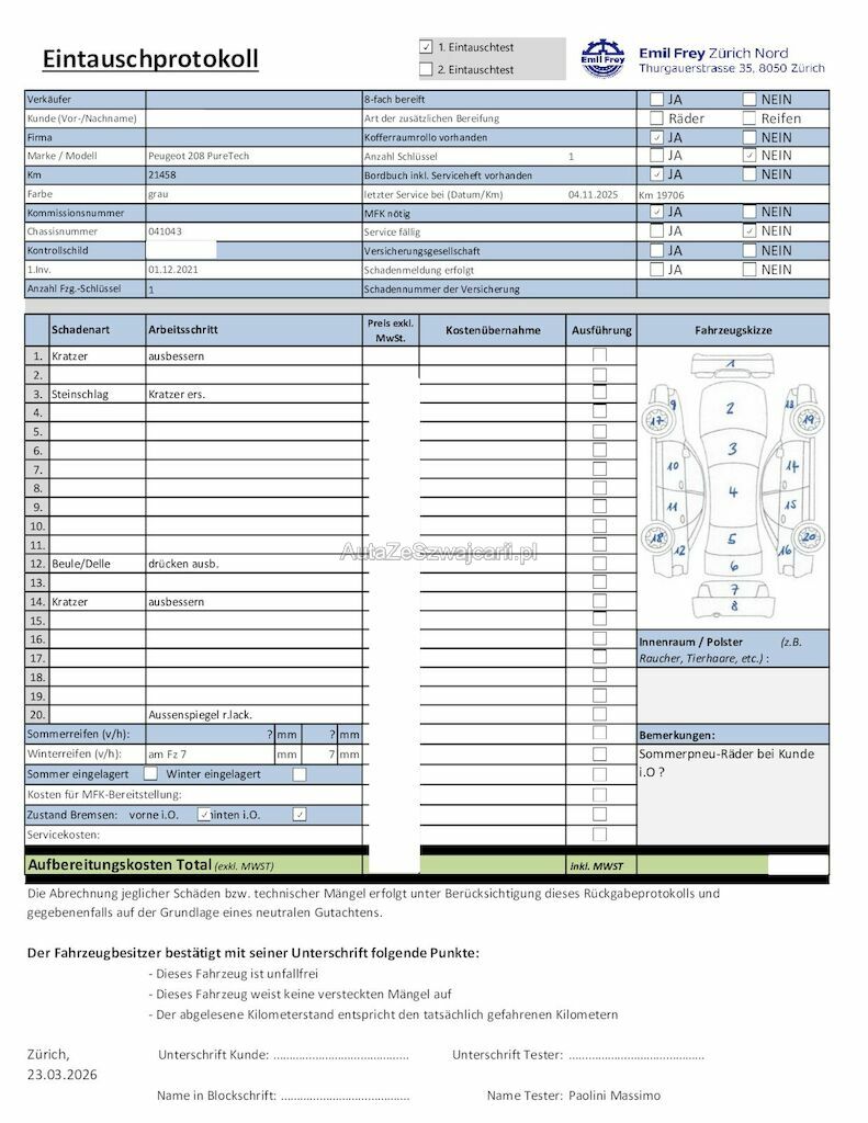 | Information | Keine technische Prüfung (Werkstatttest) vorgenommen Diverse Schäden an Karosserie/Lack. 8-fach bereift. Fahrzeug ab Platz, ohne Garantie und Aufbereitung. Keine Gewähr auf die Angaben der Sonder- und Serienausstattung / keine mechanische Prüfung. Fahrzeug wurde unzerlegt expertisiert / keine Haftung für allfällige, nach Demontage bekanntwerdenden Mängel. Fahrzeugbereifung und Ausstattung gemäss Fotos / Fahrzeugkauf auf eigenes Risiko ab Platz ohne Nachwährschaft. - Div. Dellen und Kratzer - 4 Raddeckel fehlen |