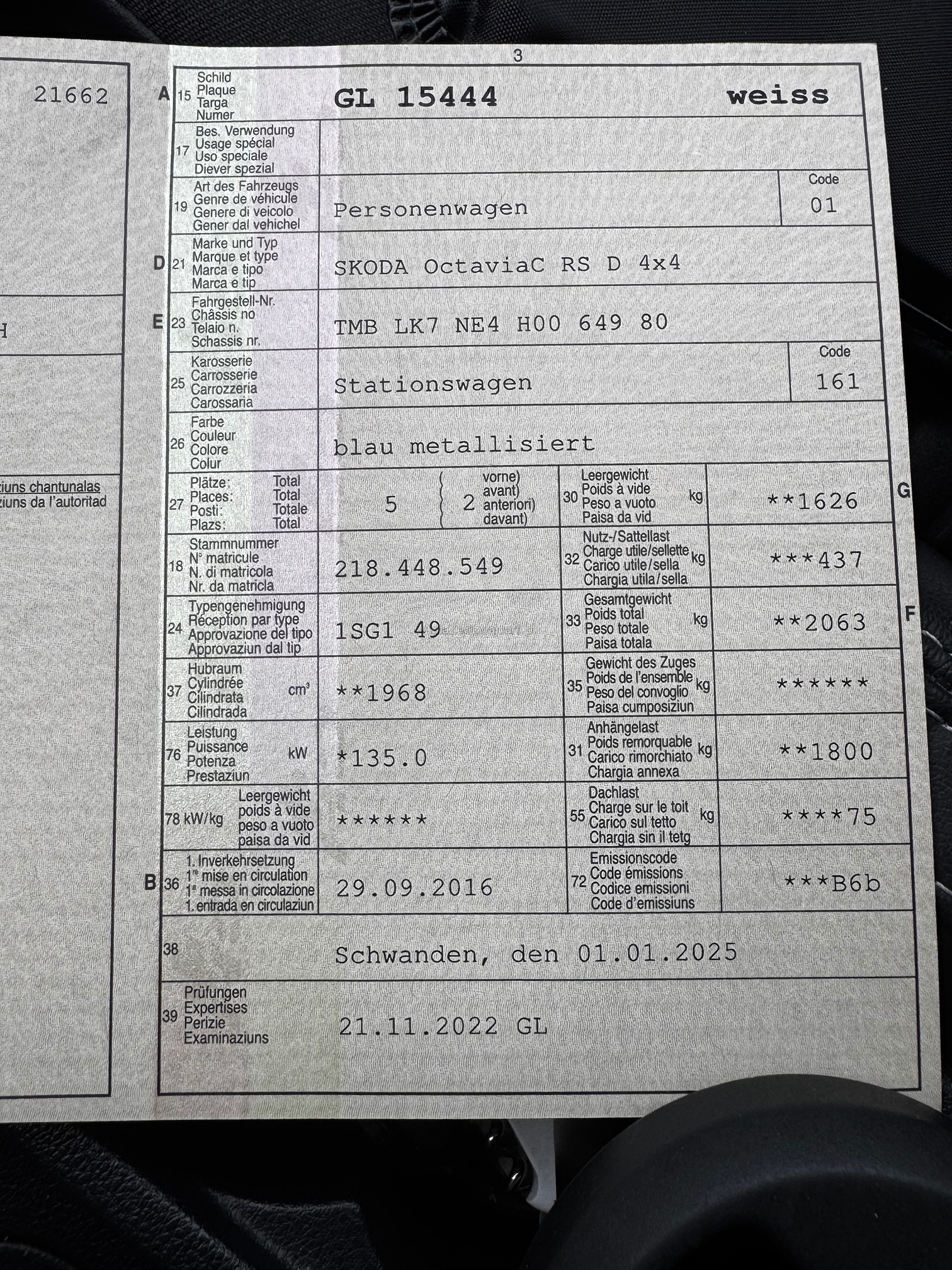 | Kommentar | Auto ist optisch in einem guten Zustand. Servicearbeiten wurden immer bei uns durchgeführt (Skoda Vertragswerkstatt) Auspuffenden haben keine Russspuren, daher wurde kein Partikelfiltertest durchgeführt. |