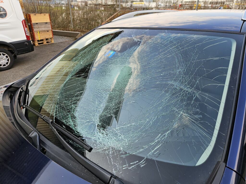 Seiten und Frontschaden links: Stossfänger vorne gebrochen, Kotflügel deformiert, Seitenspiegel gebrochen, Frontscheibe gerissen.