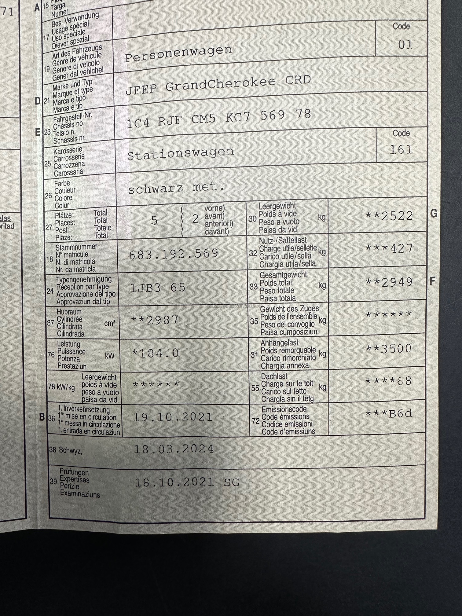 | Kommentar | Partikelfilter Test am 18.02.2026 km 101'185 durchgeführt und bestanden - siehe Foto Ausdruck / Sommerpneu auf original Felgen gehören auch noch dazu / siehe Foto Radio Bildschirm ! / Am Fahrzeug wurde keine Werkstattprüfung durchgeführt. Für sichtbare oder nicht sichtbare Mängel wird keine Haftung übernommen. Das Risiko liegt vollständig beim Käufer / KM Stand +/- da Kunde weiter fährt |