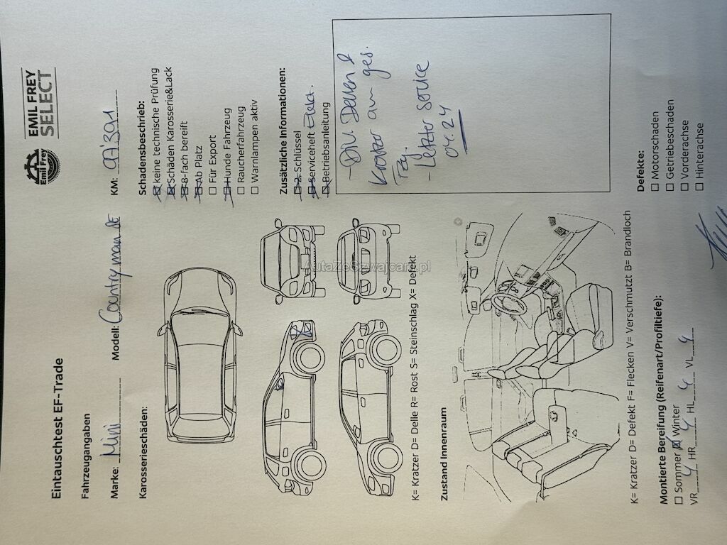 | Information | Keine technische Prüfung (Werkstatttest) vorgenommen Diverse Schäden an Karosserie/Lack. Fahrzeug ab Platz, ohne Garantie und Aufbereitung. Keine Gewähr auf die Angaben der Sonder- und Serienausstattung / keine mechanische Prüfung. Fahrzeug wurde unzerlegt expertisiert / keine Haftung für allfällige, nach Demontage bekanntwerdenden Mängel. Fahrzeugbereifung und Ausstattung gemäss Fotos / Fahrzeugkauf auf eigenes Risiko ab Platz ohne Nachwährschaft - Div. Dellen und Kratzer am gesamten Fahrzeug. - Hundefahrzeug!! - Letzter Service 04.2024 |