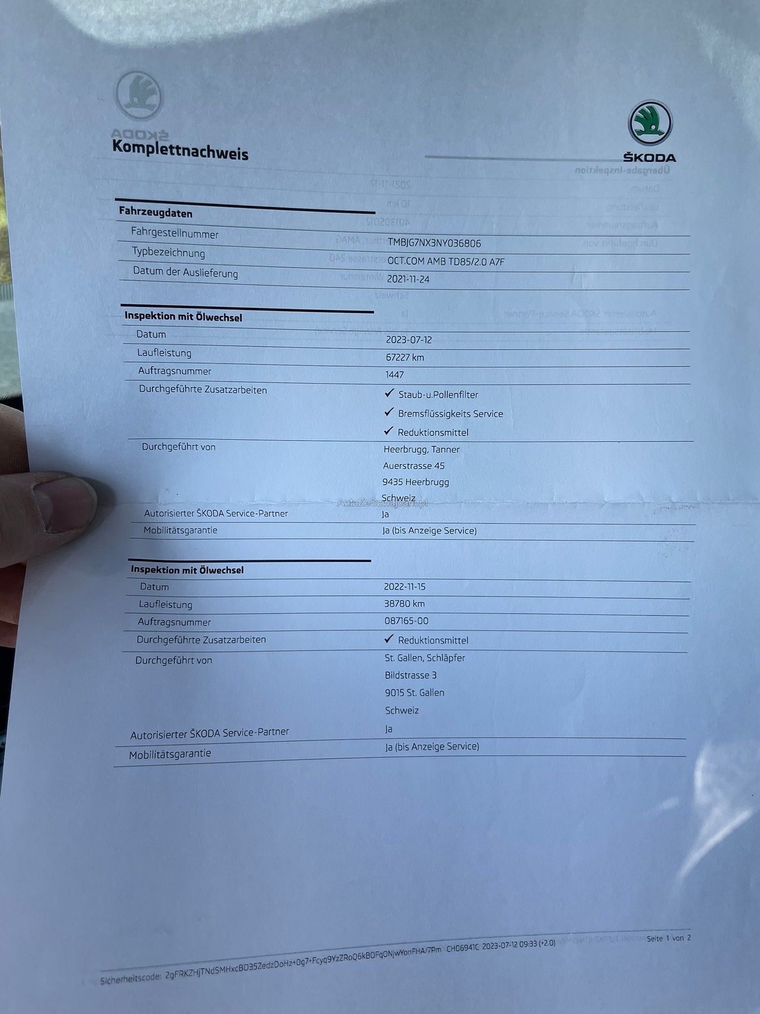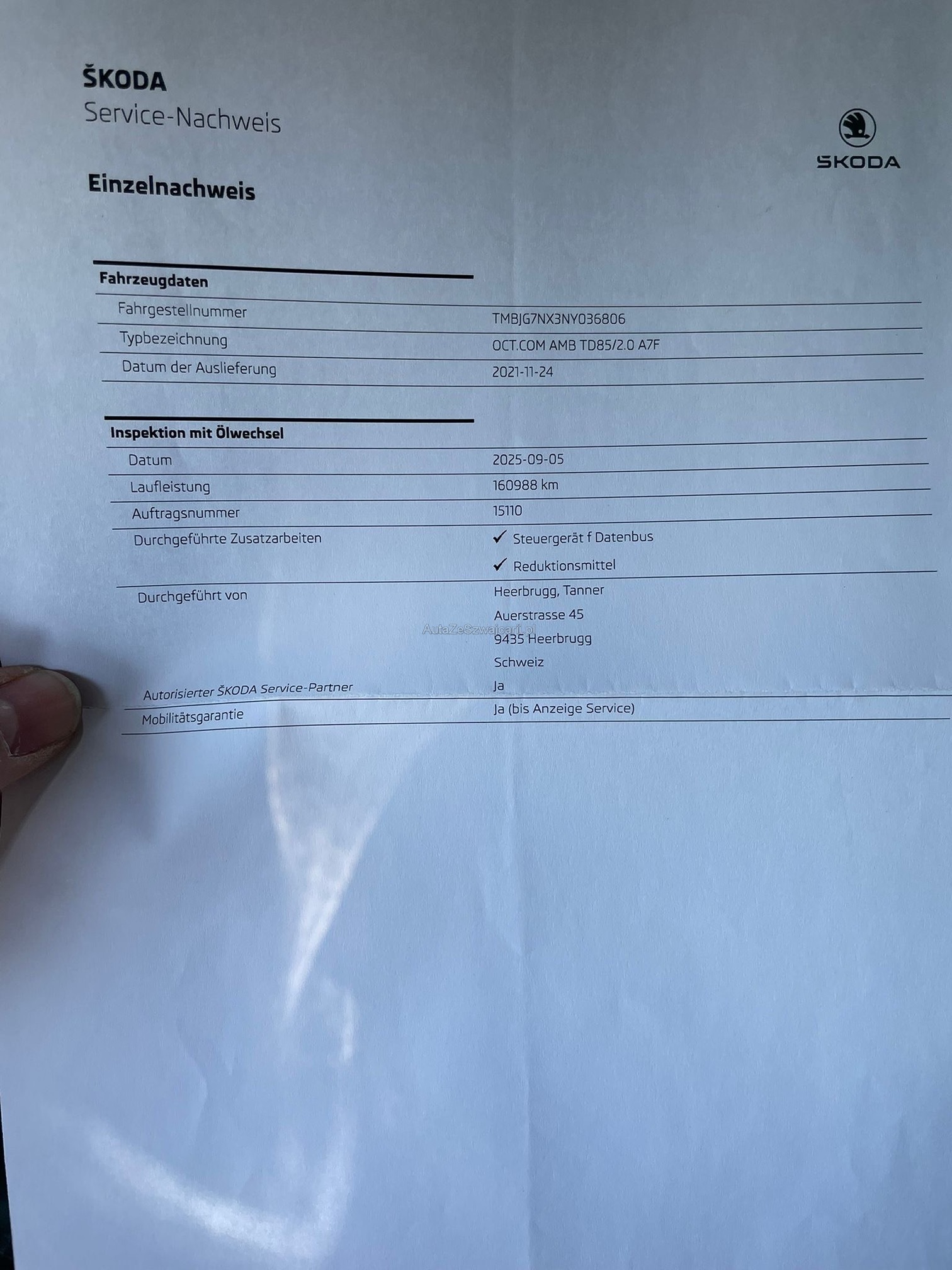 | Kommentar | Am Fahrzeug wurde kein Werkstatttest gemacht (Für sichtbare oder nicht sichtbare Mängel wird nicht gehaftet). Wir testen & kontrollieren nicht alle Funktionen vom Fahrzeug. Das Risiko liegt somit vollumfänglich beim Käufer. Nachdem der Höchstbietende den Zuschlag erhalten hat, gibt es keine Nachverhandlung, auch wenn nicht deklarierte Mängel zum Vorschein kommen sollten. Ab Platz ohne Garantie, die Gewährleistung ist vollständig ausgeschlossen, damit insbesondere auch Wandelung und Minderung. _ Sonderausstattung gemäss Eurotax ohne Gewähr: _ Assist: Regensensor mit Lichtassistent (Coming Home, Leaving Home, Tunnel Light) Scheibenwaschdüsen beheizt Media: SmartLink Premium Assist: Berganfahrassistent SunSet (Heckscheibe und hintere Seitenscheiben dunkel getönt) Paket: Navi Pack (Ambition) Räder: Leichtmetallräder 7,0 Jx 17" (ROTARE) silber 205/55 R17 Räder: Stahlnotrad inkl. Wagenheber, Radschraubenschlüssel (ohne Pannenset) Anhängerkupplung, mechanisch anklappbar mit elektrischer Entriegelung Paket: mySKODA Pack Basic Lackierung: Metallic-Lackierung |