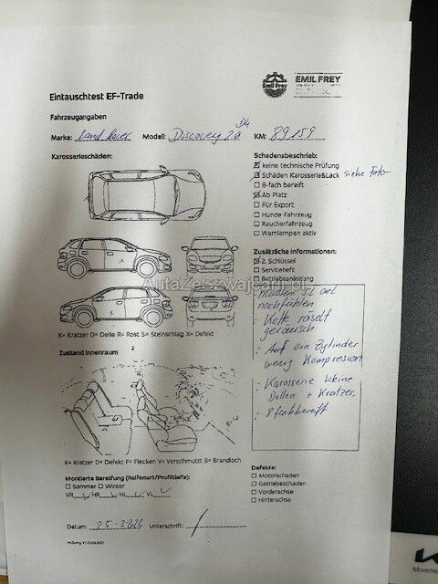| Information | Das Fahrzeug hat auf ein Zylinder sehr wenig Kompression, wir mussten 5L Oel nachfühlen Motor Kette macht Geräusch. Wir Empfehlen das Fahrzeug nicht zu Fahren, besser Fz Aufladen 2X Schlüssel vorhanden Winter- Sommer Pneu Allgemeiner Zustand gemäss Bilder, ansonsten von unserer Seite, keine weiteren Technische Prüfung durchgeführt. |