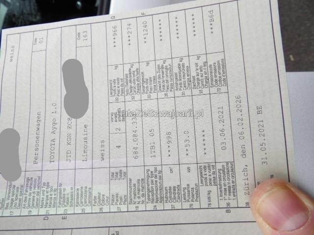 | Condition_and_Equipment | Zustand Fahrzeug ist rollbar. Bereifung Fahrzeug wird mit Winterräder abgegeben. Schlüssel Nur ein Schlüssel vorhanden. --- Rechts Rechte Seite beschädigt. Anstoss rechts im Bereich der A-Säule. Anstoss rechts im Bereich der B-Säule. Anstoss rechts im Bereich der C-Säule. Tür vorne rechts ist eingedrückt. Tür hinten rechts ist eingedrückt. Front Kotflügel vorne rechts eingedrückt. Achse Risiko Vorderachse. Innenraum Unangenehme Geruchsentwicklung im Innenraum (z.B. Treibstoff, Lebensmittel, Rauch, etc.) --- Serienaustattung Airbag Fahrer und Beifahrerseite Servolenkung Lenkrad verstellbar Reifendruck-Kontrollsystem RDK Stabilitätskontrolle Bodenteppiche ABS und Bremsassistent BAS Seitenairbags vorne Isofix-Kindersitzbefestigung hinten HSA Berganfahrassistent Klimaanlage manuell mit Pollenfilter LED Tagfahrlicht Keine Gewähr auf die Angaben der Serienausstattungen Garantie 10 Jahre/ 160'000 km |