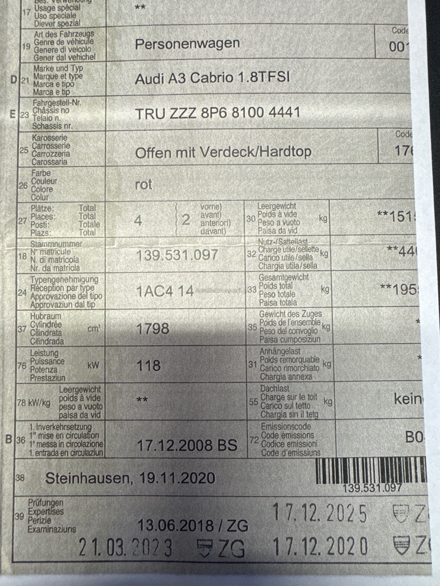 | Kommentar | Am Fahrzeug wurde kein Werkstatttest gemacht (Für sichtbare oder nicht sichtbare Mängel wird nicht gehaftet). Wir testen und kontrollieren nicht alle Funktionen vom Fahrzeug. Das Risiko liegt somit vollumfänglich beim Käufer. Nachdem der Höchstbietende den Zuschlag erhalten hat, gibt es keine Nachverhandlung, auch wenn nicht deklarierte Mängel zum Vorschein kommen sollten. Ab Platz ohne Garantie, Wandelung und Minderung werden wegbedungen. |