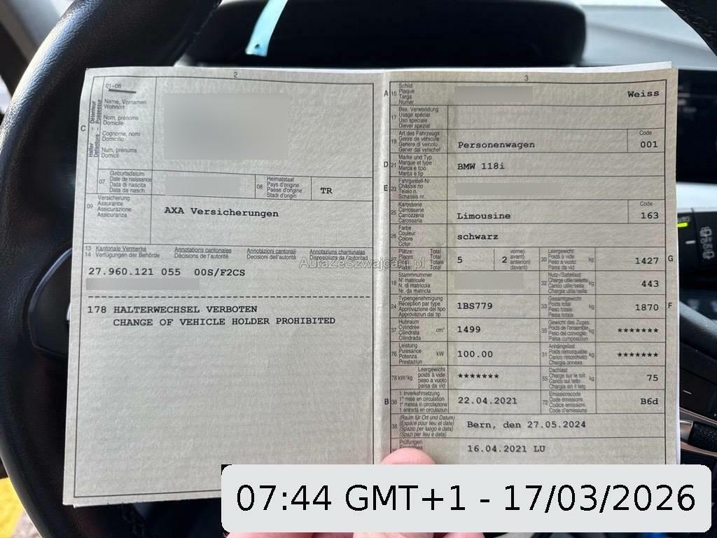 | Sonderausstattung | Paket: Modell Advantage (Assist: Geschwindigkeitsregelung mit Bremsfunktion, Assist: Park Distance Control vorne und hinten, Paket: Ablagenpaket), Paket: Ablagenpaket (Fahrer- und Beifahrersitz: Netze an Sitzlehnerückseite, jeweils in Farbe der Sitzblende, Mittelkonsole, hinten: eine Steckdose (12 V) sowie eine Doppel-USBBuchse (nur Laden: Typ C/3,0 A), Klappfach Instrumententafel Fahrerseite), Licht: LED Scheinwerfer, Sitze: Vordersitze heizbar, BMW Garantie: 3 Jahre oder 100'000 km Gratis-Service: 10 Jahre oder 100'000 km (ab 1. Inv.), Räder: 17" Leichtmetallräder Vielspeiche 546 Reflexsilber 7,5J×17/Bereifung 225/45 R 17, Lenkrad: Sport-Lederlenkrad, Sonnenschutzverglasung - Stärker eingefärbte Verglasung ab der B-Säule im hinteren Fahrzeugbereich |