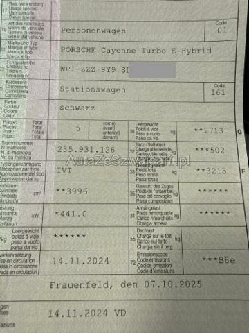 | Condition_and_Equipment | Verkauf Der Verkauf erfolgt durch den Halter in Zusammenarbeit mit der Firma TeamConsulting, nicht durch die XpertCenter AG. Das Fahrzeug muss bei Abholung bar vor Ort bezahlt werden. Zusätzlich zum Gebot fällt eine Handlinggebühr an. Demontage Persönliche Gegenstände oder Ladegut im Fahrzeug werden entfernt. Zustand Fahrzeug ist fahrbar. Bereifung Fahrzeug wird mit Winterräder abgegeben. Sonstiges Fahrzeugdokumente vorhanden. Kategorie Das Fahrzeug wird vom Besitzer noch benutzt. Hersteller- und Gewährleistungsbedingungen Die Fahrzeuggarantie oder Gewährleistung wird möglicherweise nicht vom Hersteller fortgeführt Weitere wichtige Hinweise Fahrzeug hatte einen Front- Seiten und Heckschaden links. --- Achse Risiko Vorderachse. Risiko Hinterachse. Risiko Lenkung. Elektrik Risiko Steuergeräte. Sonstige Schäden Div.Carrosserie Teile sind leicht beschädigt. Hochvoltfahrzeug Keine sichtbaren Schäden am Antriebsakku Weitere Beschädigungen Fahrzeug hat Software Probleme. Fahrzeug hat Ausfälle der Assistenzsysteme. --- Serienaustattung Airbag Fahrer und Beifahrerseite Elektrische Fensterheber vorne + hinten ABS Antiblockiersystem Sprachbedienungssystem Scheibenwischer mit Regensensor Reifendruck-Kontrollsystem RDK Fussmatten Audiosystem Aussenspiegel elektrisch verstellbar/ heizbar und anklappbar Alarmanlage mit Innenraumüberwachung Einstiegsleisten Edelstahl Zwei Zonen-Klimaautomatik ESP/ ASR/ MSR Aussenspiegel und Innenspiegel automatisch abblendend Vorhangairbags Seitenairbags vorne Knieairbag Fahrer und Beifahrerseite Tempostat Park-Distanz-Sensor vorne + hinten/ Rückfahrkamera Rücksitze geteilt umklappbar 40/20/40 HDC Hill Descent Control/ Bergabfahrkontrolle Start + Stopp Funktion LED Tagfahrlicht Details siehe gültige Preisliste des Importeurs Ladekabel Keine Gewähr auf die Angaben der Serienausstattungen Vorbereitung für Anhängevorrichtung DAB+ Digital Audio Broadcast 2 USB-Anschlüsse Matrix LED-Scheinwerfer Ablage für Smartphone 2 USB-C Anschlüsse Sonderausstattung Metallic-Lackierung Luftfederung + Niveauregulierung Servotronic Heizbare Frontscheibe Panoramadach elektrisch Dachhimmel Alcantara Garagen-Toröffner HOME LINK Luftgütesensor Ambientebeleuchtung Sitzheizung vorne + hinten Seitenairbags hinten Dachreling schwarz Radschrauben mit Diebstahlsicherung Pack Sport Design Pack Exterieur schwarz Head-Up Display Porsche Wappen auf Kopfstützen Komfortzugang Türschliesssystem Soft Close Vier Zonen-Klimaautomatik Sonnenschutzrollo für Seitenfenster hinten elektr. Aussenspiegel in Carbon Geräusch- und Wärmeschutzverglasung inkl. Privacy-Verglasung Pack Adaptive Sportsitze inkl. Komfort-Memory-Paket Aktive Sitzbelüftung vorn und hinten Burmester High-End Surround Sound -System Spurwechselassistent Reifendichtmittel mit Kompressor LED Rückleuchten abgedunkelt Pack Interieur Carbon Umfeldbeleuchtung mit Markenlogo Hinterachslenkung Multifunktionslenkrad Alcantara inkl. Lenkradheizung Abstandsregeltempomat inkl. InnoDrive Sport-Abgasanlage schwarz Bremszangen schwarz lackiert Schriftzug in Schwarz Beifahrer Display Matrix LED-Scheinwerfer abgedunkelt Parkassistent/ Surround View |