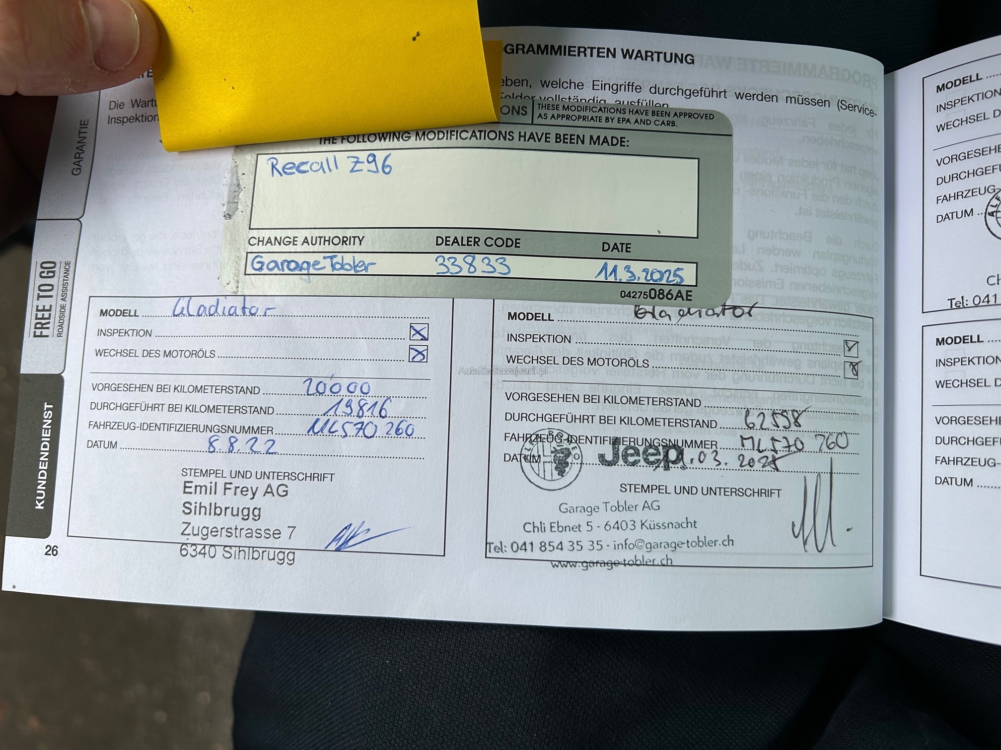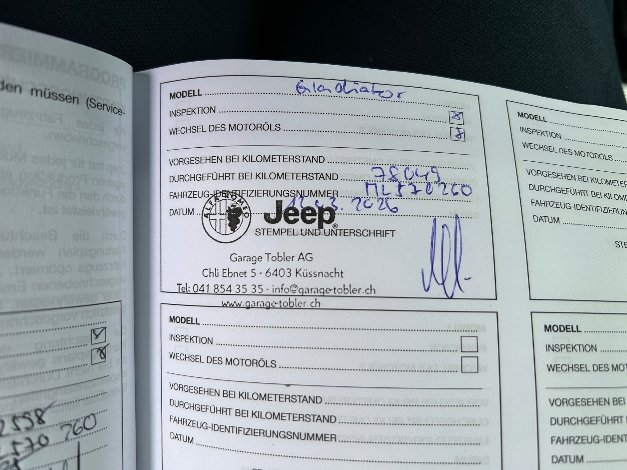| Kommentar | Der Jeep wurde höher gelegt + Offroad Rad montiert (eingetragen) AHK mit 3'400 KG Anhängelast Frisch ab MFK am 09.03.2026 bestanden Frisch ab Service 12.03.2026 Neue Bremsen vorne komplett Neue Batterie |