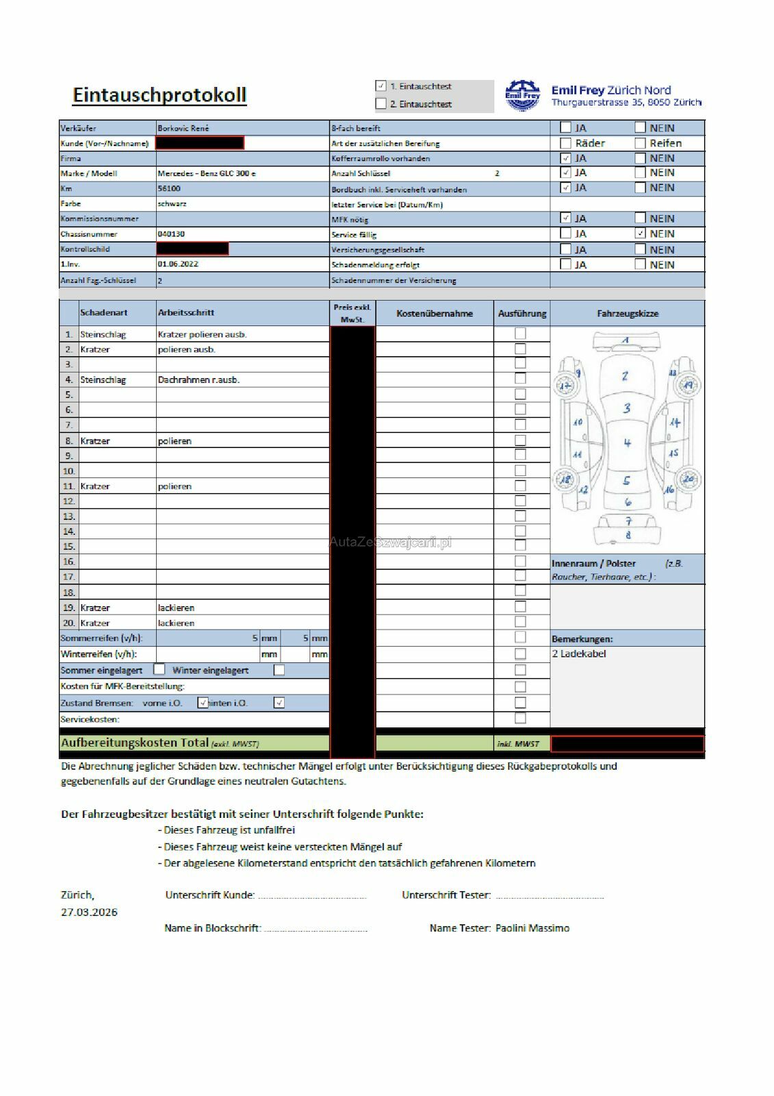 | Information | Keine technische Prüfung (Werkstatttest) vorgenommen Diverse Schäden an Karosserie/Lack. Fahrzeug ab Platz, ohne Garantie und Aufbereitung. Keine Gewähr auf die Angaben der Sonder- und Serienausstattung / keine mechanische Prüfung. Fahrzeug wurde unzerlegt expertisiert / keine Haftung für allfällige, nach Demontage bekanntwerdenden Mängel. Fahrzeugbereifung und Ausstattung gemäss Fotos / Fahrzeugkauf auf eigenes Risiko ab Platz ohne Nachwährschaft. - Serviceberichte von Mercedes Benz : Foto - Stosstange Vorne : Kratzer, polieren ausbessern - Motorhaube : Kratzer, polieren - Dachrahmen : Steinschlag, ausbessern - Stosstange Hinten : Kratzer, polieren - Türe HR : Kratzer, polieren - Felge VR : Kratzer, polieren - Felge HR : Kratzer, polieren |