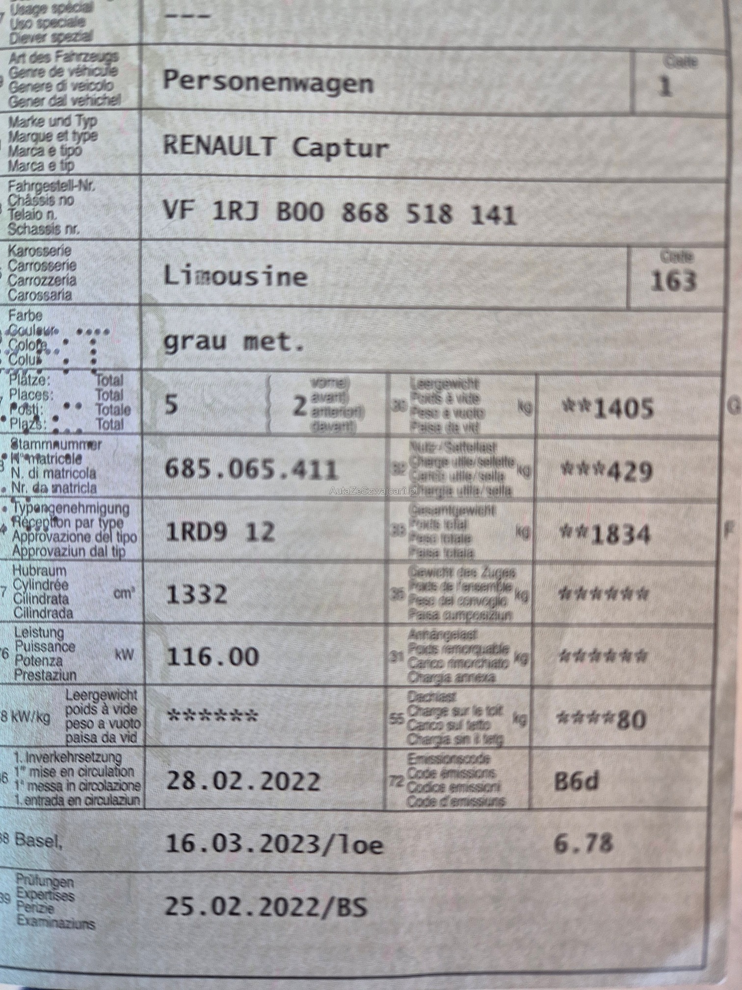 | Kommentar | Captur 1.3 TCe 160 R.S. Line EDC / Pack Winter / Pack Parking / Pack Conduite Autonome / Pack Infotainment // Am Fahrzeug wurde kein Werkstatttest gemacht (Für sichtbare oder nicht sichtbare Mängel wird nicht gehaftet). Wir testen & kontrollieren nicht alle Funktionen vom Fahrzeug. Das Risiko liegt somit vollumfänglich beim Käufer. Nachdem der Höchstbietende den Zuschlag erhalten hat, gibt es keine Nachverhandlung, auch wenn nicht deklarierte Mängel zum Vorschein kommen sollten. Ab Platz ohne Garantie, Wandelung und Minderung werden wegbedungen. Abholung nach Zuschlag innert 5 Tagen. Das Fahrzeug kann vorgängig am Steinackerweg 12 in 4322 Mumpf besichtigt werden. |