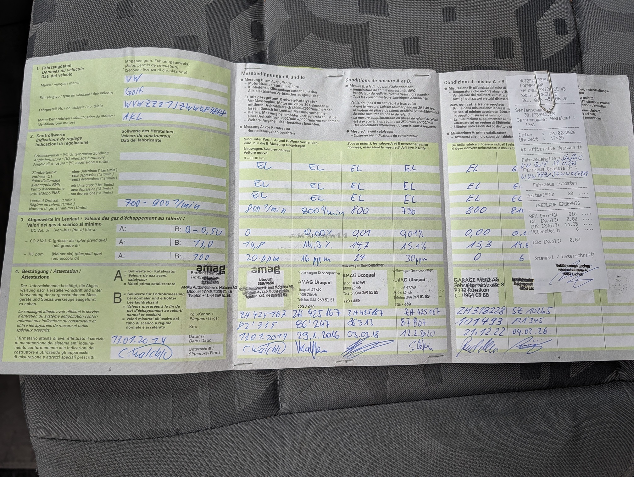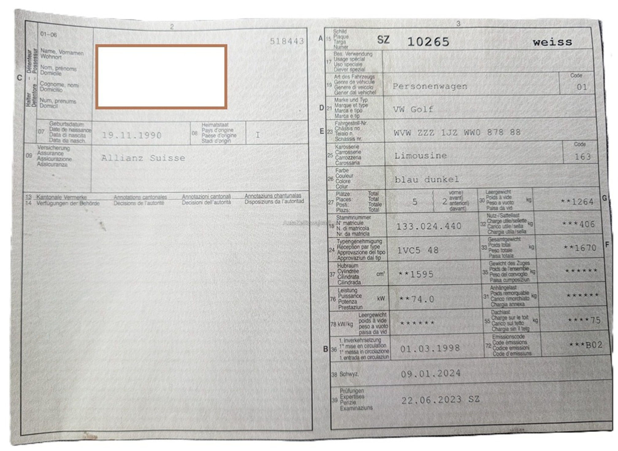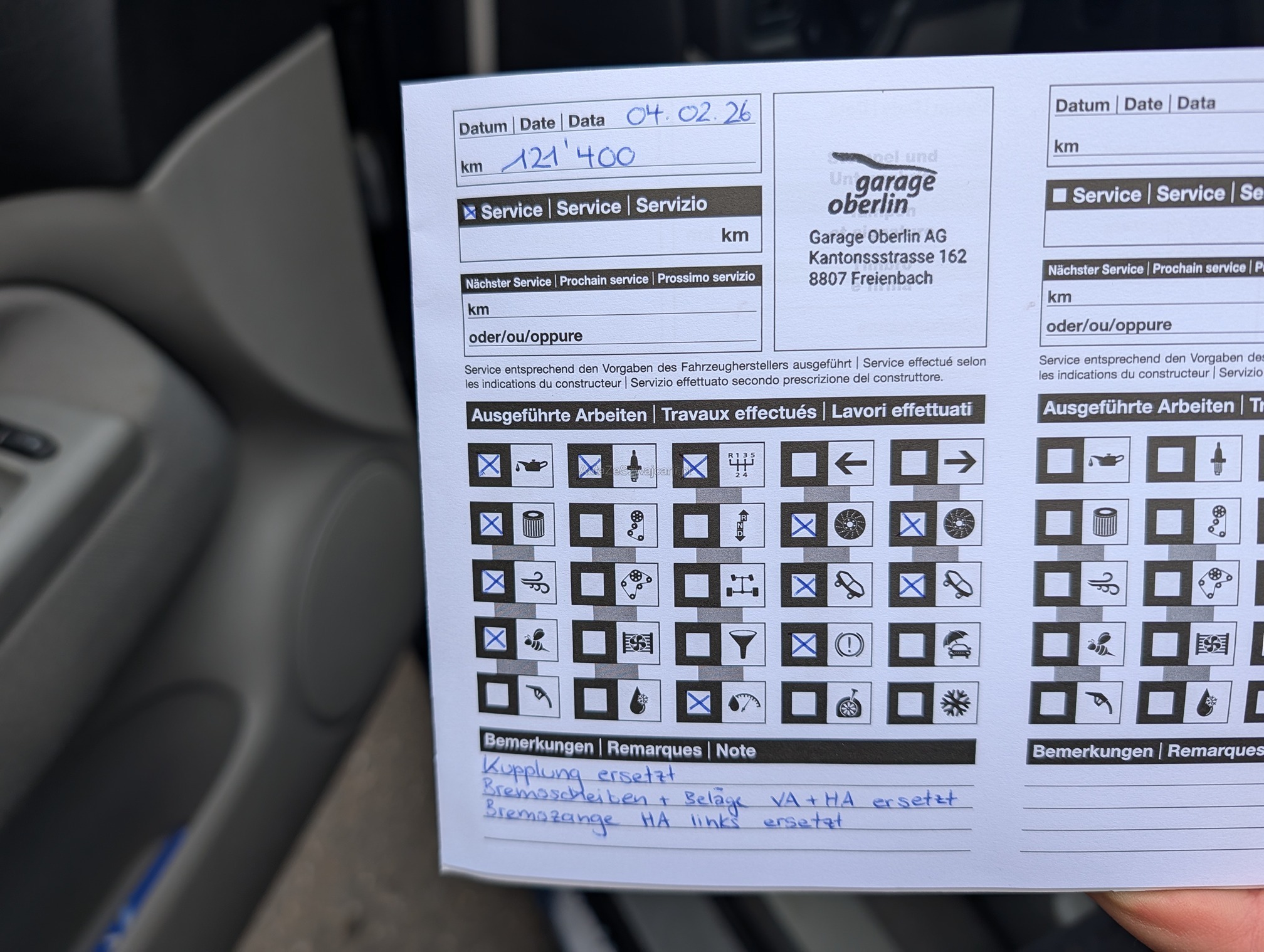 | Kommentar | Service (Ölfilter, Pollenfilter, Luftfilter, Zündkerzen), Bremsen vorne & hinten komplett ersetzt, Bremssattel hi. links ers., Spurstangen li. & re. ersetzt, Kupplung ersetzt. Alles bei 121'000km Diverse Lackschäden siehe Fotos. Am Fahrzeug wurde kein Werkstatttest gemacht (Für sichtbare oder nicht sichtbare Mängel wird nicht gehaftet). Wir testen und prüfen nicht alle Funktionen vom Fahrzeug. Das Risiko liegt somit vollumfänglich beim Käufer. Nach Erhalt des Zuschlags, gibt es keine Nachverhandlung, auch wenn nicht deklarierte Mängel zum Vorschein kommen. Ab Platz ohne Garantie oder Gewährleistung, Wandelung und Minderung werden wegbedungen. |