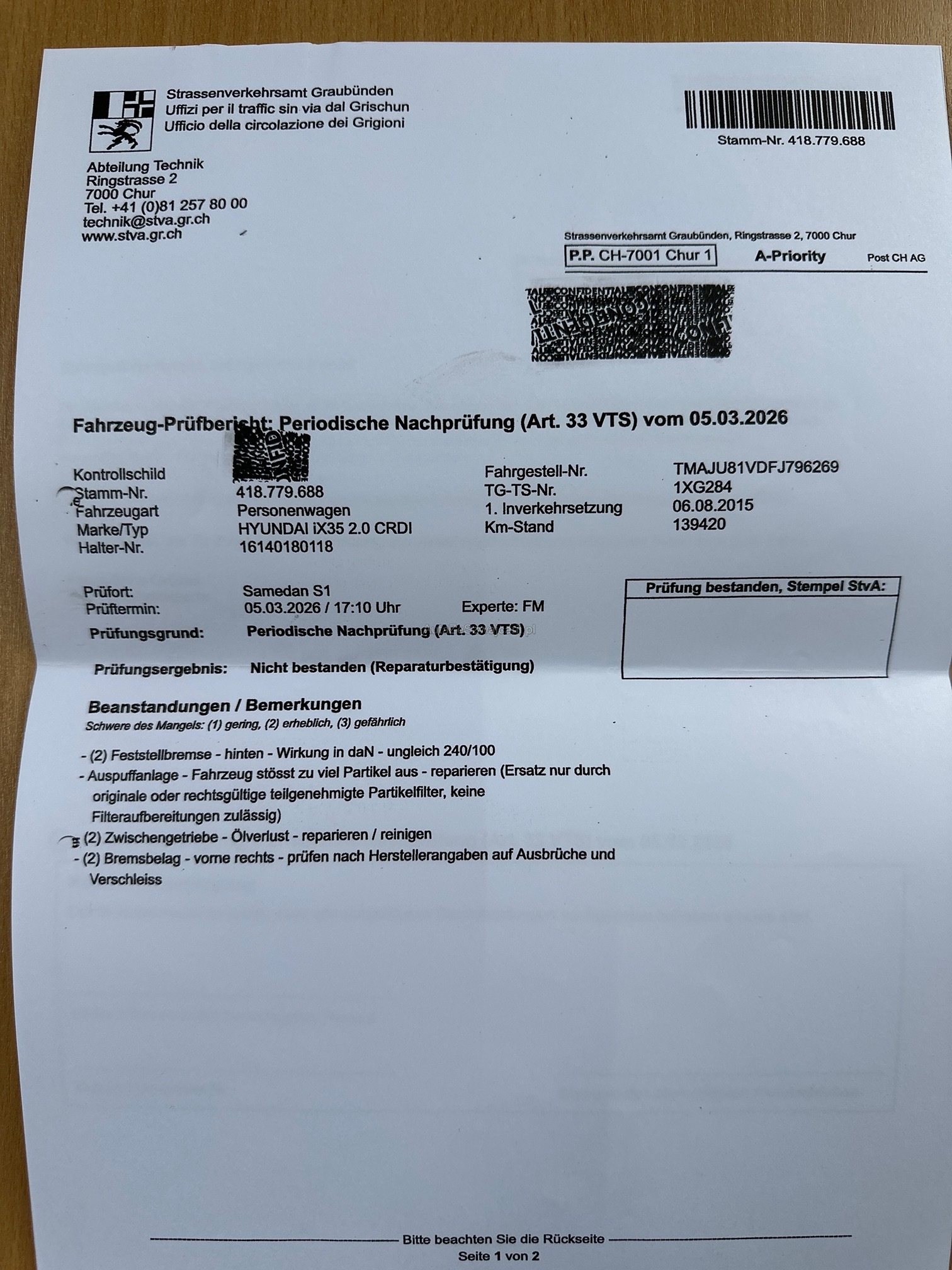 | Kommentar | Fahrzeug ist optisch in einem sehr guten Zustand, normale Gebrauchsspuren! Der Hyundai wurde bis heute Freitag 27.03.2026 jeden Tag gefahren ohne Probleme. Da er die MFK Prüfung nicht bestanden hat, hat der ehemalige Halter ein neues Fahrzeug gekauft. -Fahrzeug mit diversen MFK Mängel, siehe Prüfbericht. -Bremsen vorne müssen ersetzt werden. -Diverse kleine Steinschläge, Kratzer und Dellen. Normale Gebrauchsspuren (siehe Fotos) -Zwischengetriebe Ölverlust -Partikelmessung nicht bestanden (siehe Foto) -Service fällig 8-fach Bereifung inkl. Alufelgen, Profiltiefe Winterreifen ca. 6mm, Sommerreifen ca. 4mm Kein Werkstatttest getätigt Jede Gewährleistung, soweit nach Gesetz möglich, wird wegbedungen. Insbesondere sind Wandelung und Minderung ausgeschlossen. Nach Zuschlag muss das Fahrzeug innerhalb von 5 Arbeitstagen abgeholt werden, ansonsten verrechnen wir CHF 50.- pro Tag an Standgebühren. Jegliche Art von Ausreden werden nicht akzeptiert. |