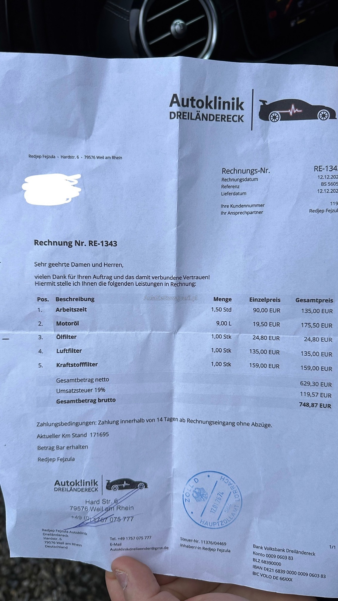 | Kommentar | Es wurde kein Werkstatttest durchgeführt. Die Bilder stammen vom Kunden. |