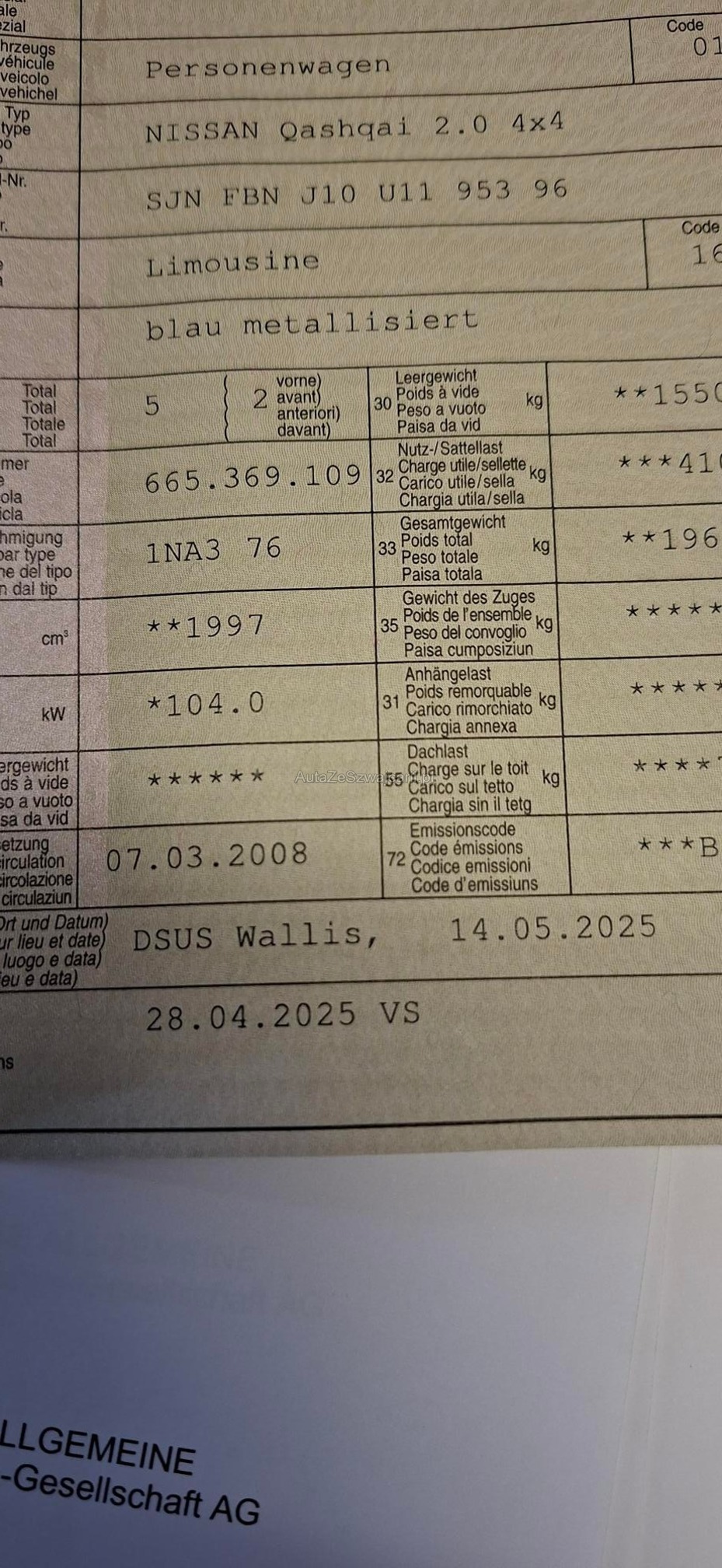 | Kommentar | Am Fahrzeug wurde kein Werkstatttest durchgeführt. Letzte MFK 28.04.2025 Airbaglampe leuchtet (wahrscheinlich ist die Wickelfeder das Problem) Fahrzeug hat Rost (siehe Bilder) |