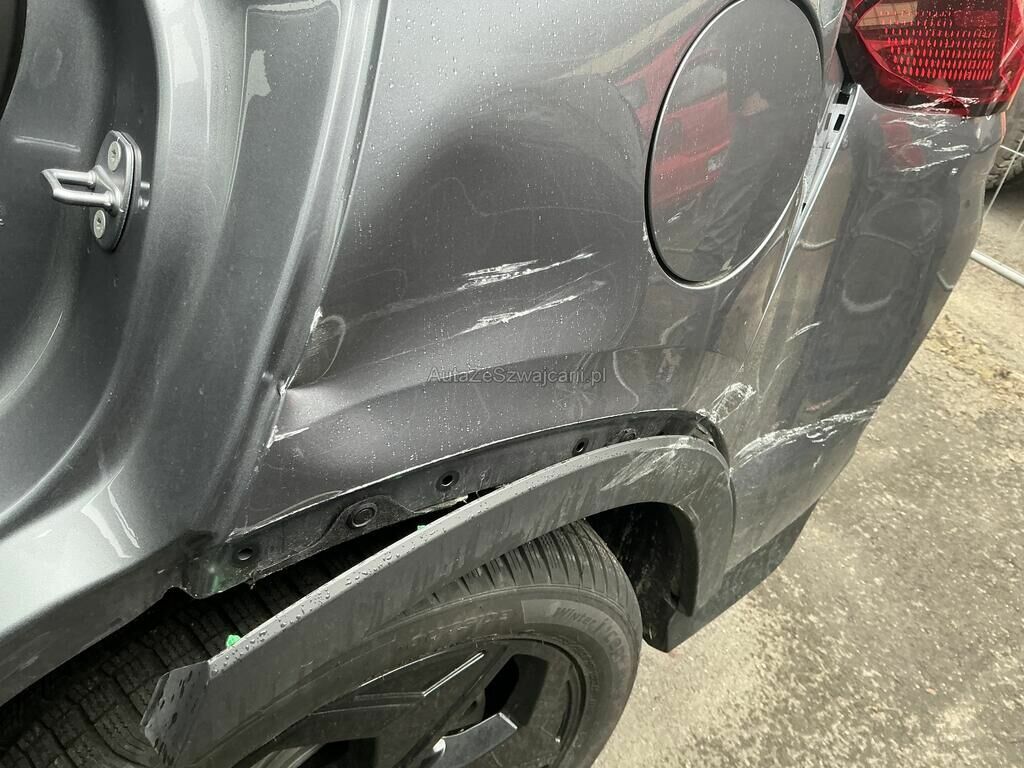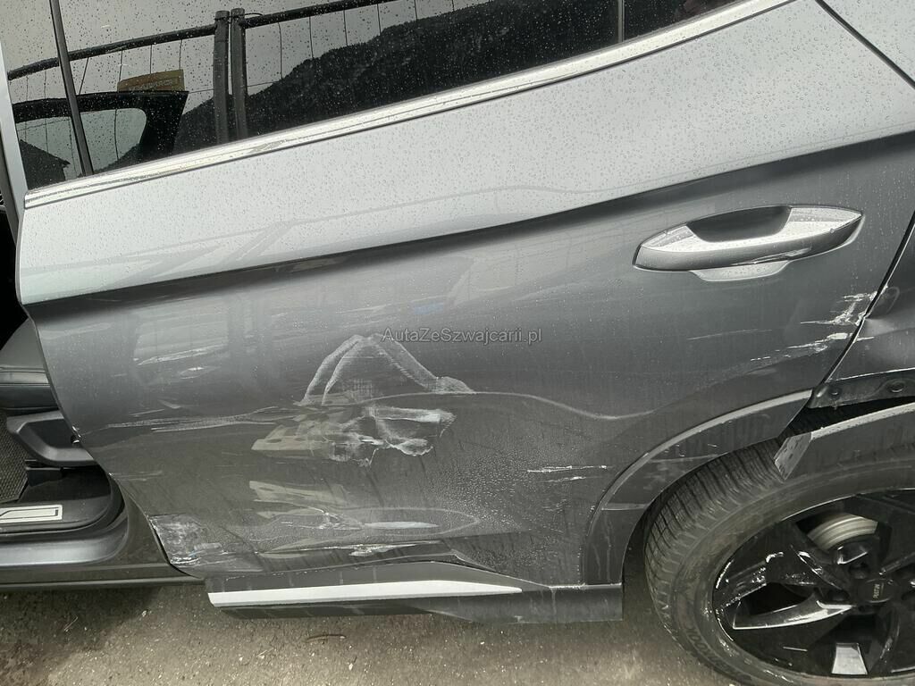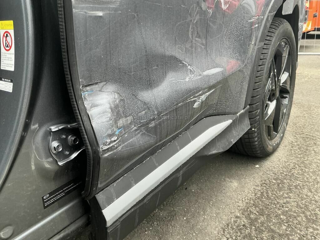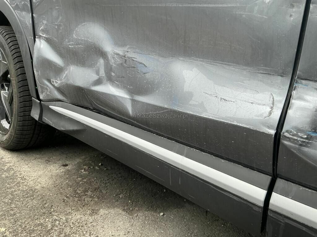 Collision du flanc gauche puis choc jante arrière droite: ailes, portes, poignées, moulures, rétroviseur, jantes, feu, pare-chocs, trains roulant et suspension endommagés.