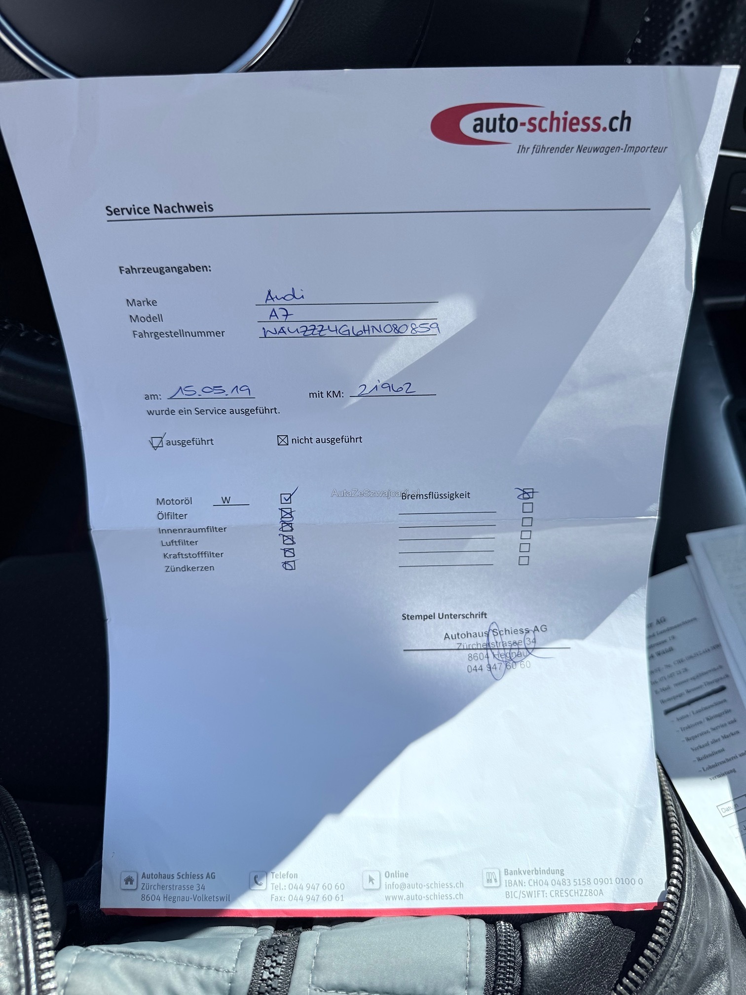 | Kommentar | Fahrzeug ist schwarz matt foliert; Originallack ist dunkelblau 2 Schlüssel; 4-fach bereift Sommer Aluminium bei Mittelkonsole teilweise gedellt und verkratzt sowie Leder in diesem Bereich ebenfalls leicht beschädigt; Fach bei Mittelarmlehne löst sich der Stoff; 1x leichte Blasenbildung auf Folie bei Haube; Vorne links kleiner Schaden an Stossfänger; Vorne unten rechts kleine Beschädigung an Spoilerlippe; Drehknopf für Helligkeit der Innenraumbeleuchtung fehlt Ansonsten ist das Fahrzeug für die Laufleistung in gepflegtem Zustand. Uns sind bei der Probefahrt keine Mängel aufgefallen. Ohne jede Garantie. Zustand gemäss Bilder. Ungereinigt ab Platz. Es wurde kein Test am Fahrzeug vorgenommen. Für sichtbare und unsichtbare Mängel wird keine Haftung übernommen. Kauf auf eigenes Risiko. Jede Gewährleistung, soweit nach Gesetz möglich, wird wegbedungen. Insbesondere sind Wandelung und Minderung ausgeschlossen. |