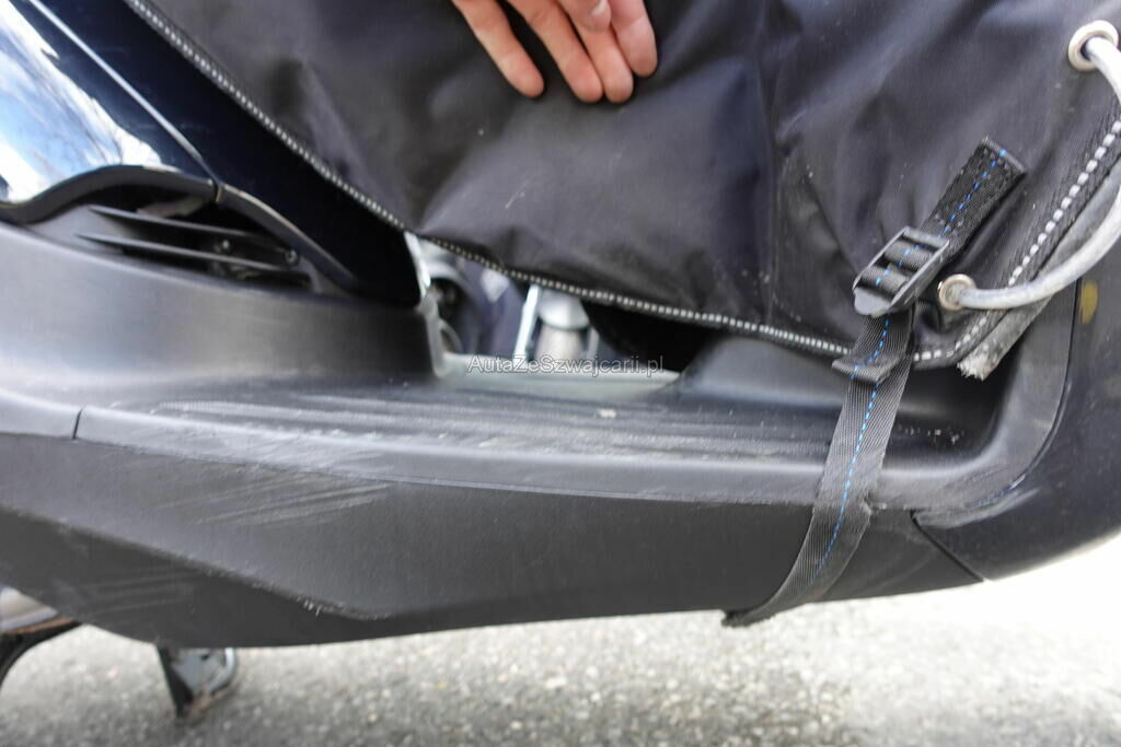 Top case, cale-pied passager, protection thermique échappement, échappement, rétroviseur, levier frein avant, couverture thermique, tablier, carénage latéral avant, bas de caisse, plancher, clignotant avant, pare-boue avant, jante et pneu avant; endommagés.