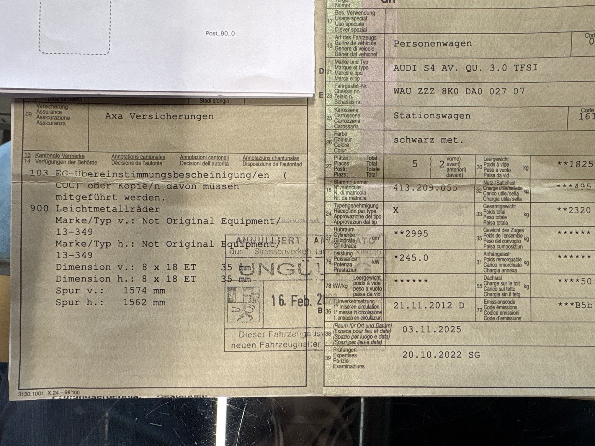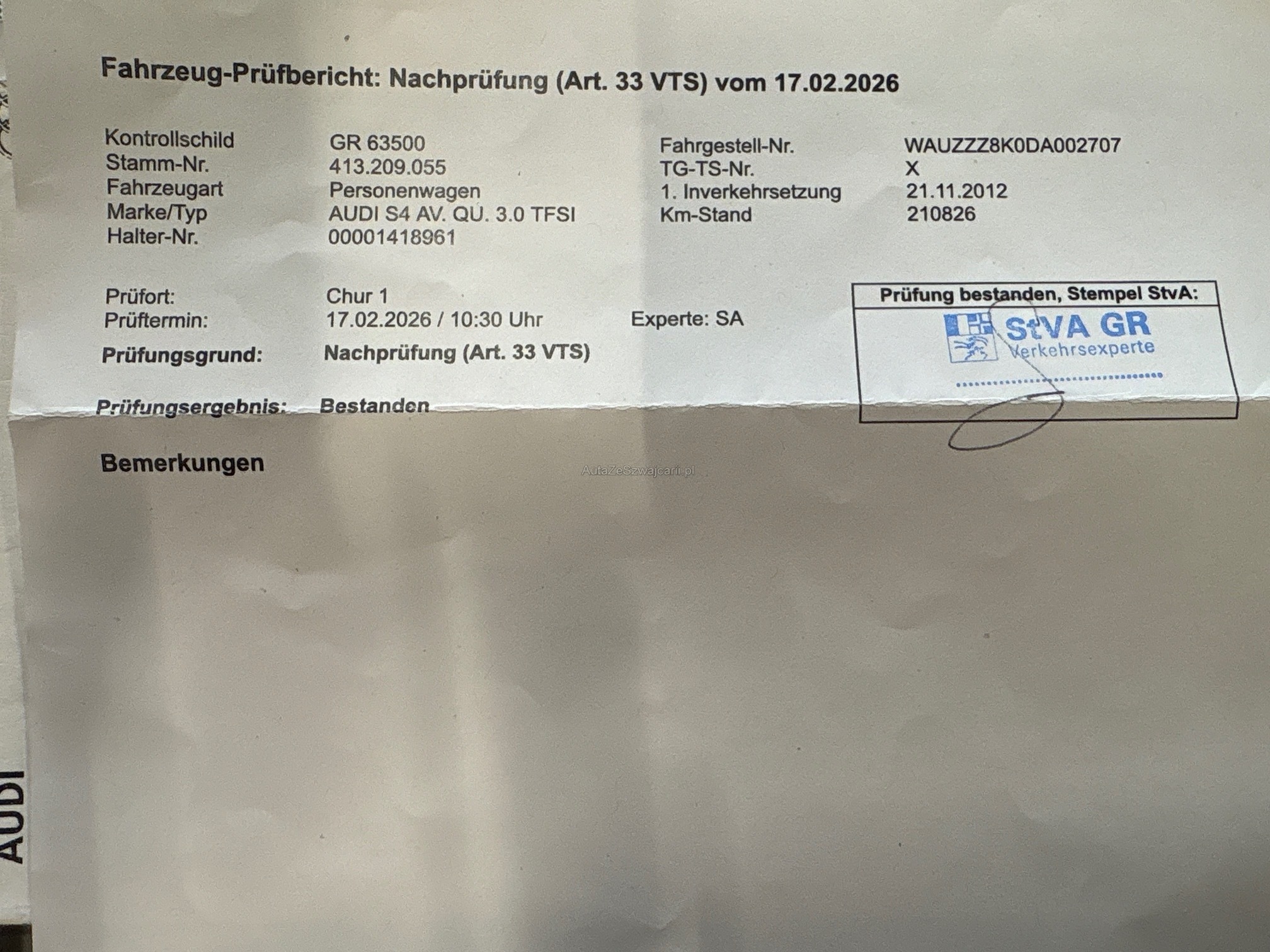 | Kommentar | Am Fahrzeug wurde kein Werkstatttest gemacht (für sichtbare oder nicht sichtbare Mängel wird nicht gehaftet). Wir haben nicht alle Funktionen vom Fahrzeug getestet und geprüft. Das Risiko liegt somit vollumfänglich beim Käufer. Nach erhalt des Zuschlags gibt es keine Nachverhandlung, auch wenn nicht deklarierte Mängel zum Vorschein kommen. Ab Platz ohne Garantie oder Gewährleistung, Wandelung und Minderung werden wegbedungen Eine Winterfelge hat einen Schlag, gemäss Kunde. |