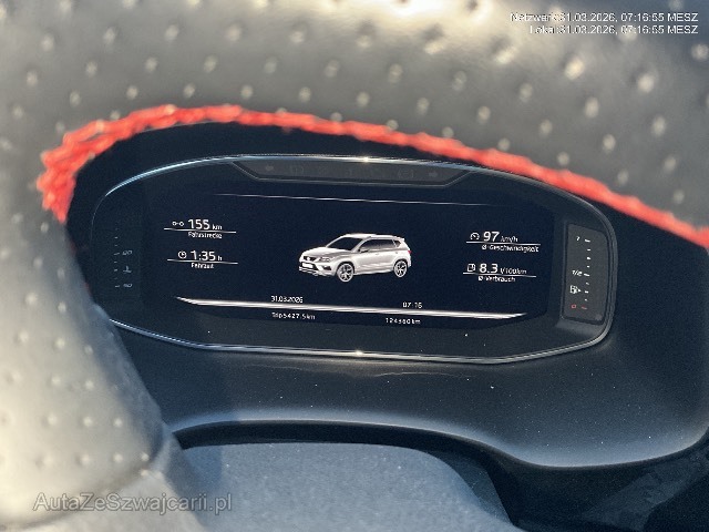 | Sonderausstattung | Anhängevorrichtung abschwenkbar, Assist: Parklenkassistent, Assist: Top View Camera (Rundumblick) -Rückfahrkamera, Frontscheibe Beheizbar, Full Digital Cockpit 10,25", Heckklappe elektrisch ''Virtual Pedal'', Lackierung: Metallic-Lackierung, Leichtmetallfelgen 19J mit Pneu EXCLUSIVE, Media: BeatsAudio Sound System, Media: Kartenmaterial ''Europa'' für Navigationssystem, Media: Navigationssystem, Paket: Fahrerassistenzpaket 4, Räder: Notrad, SEAT Garantie: Garantie 5 Jahre oder 100'000 km (ab 1. Inv.), Winterpaket |