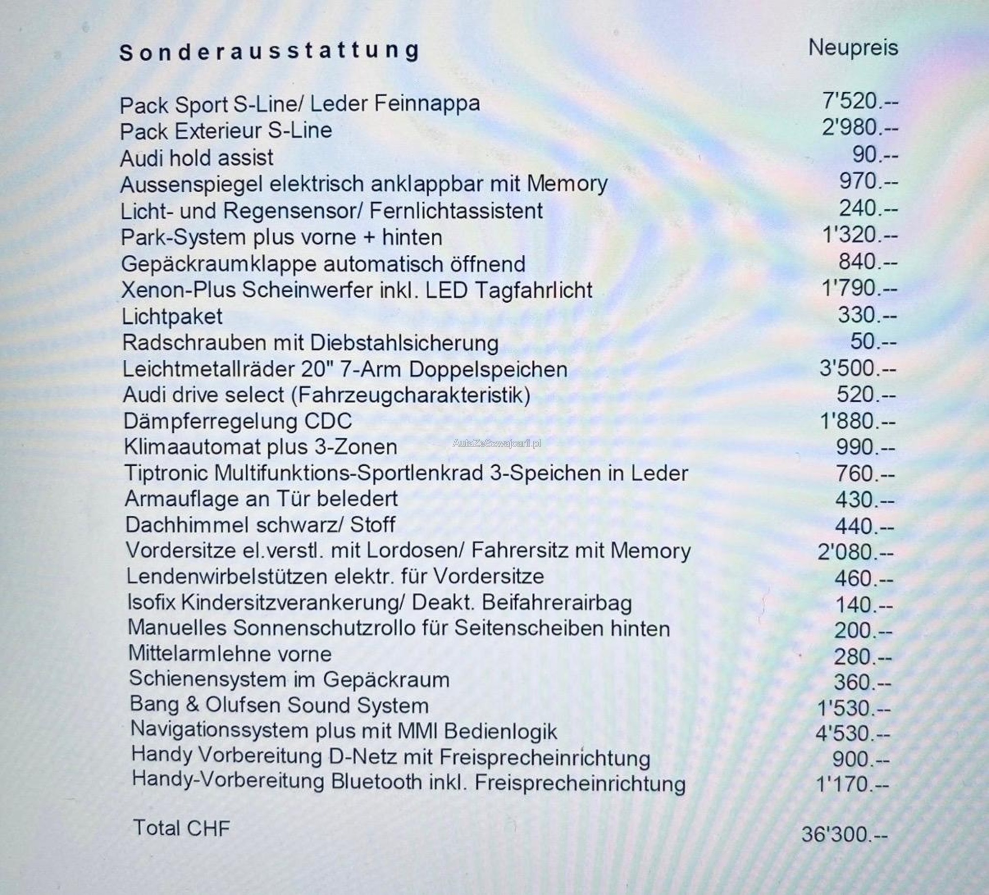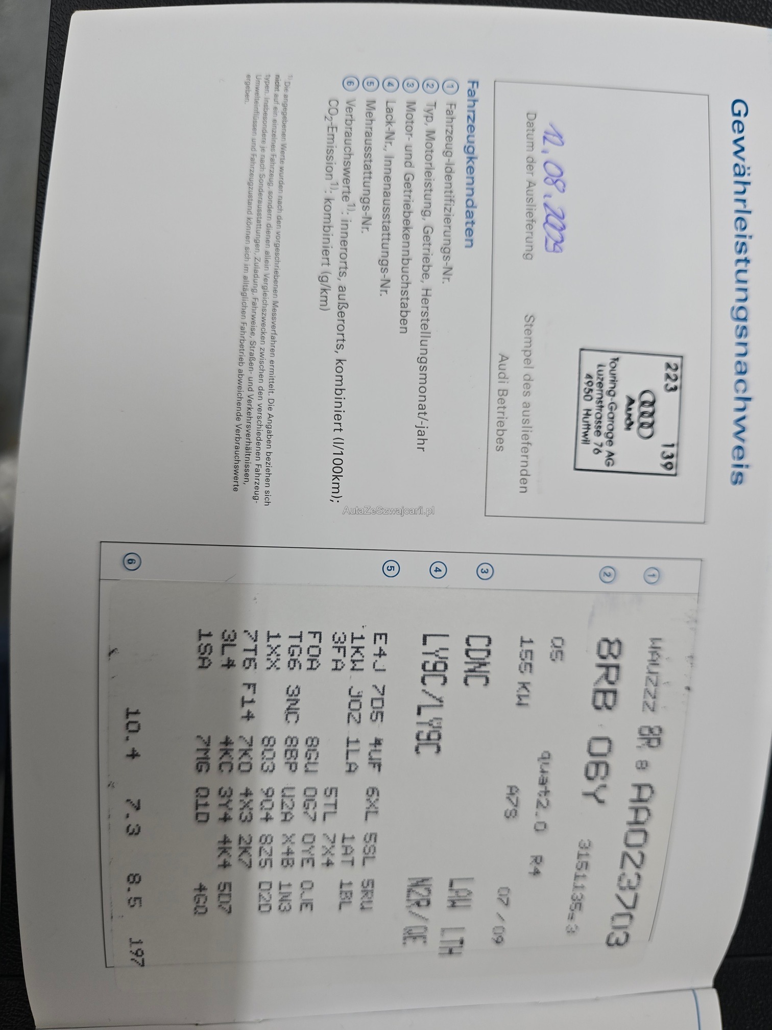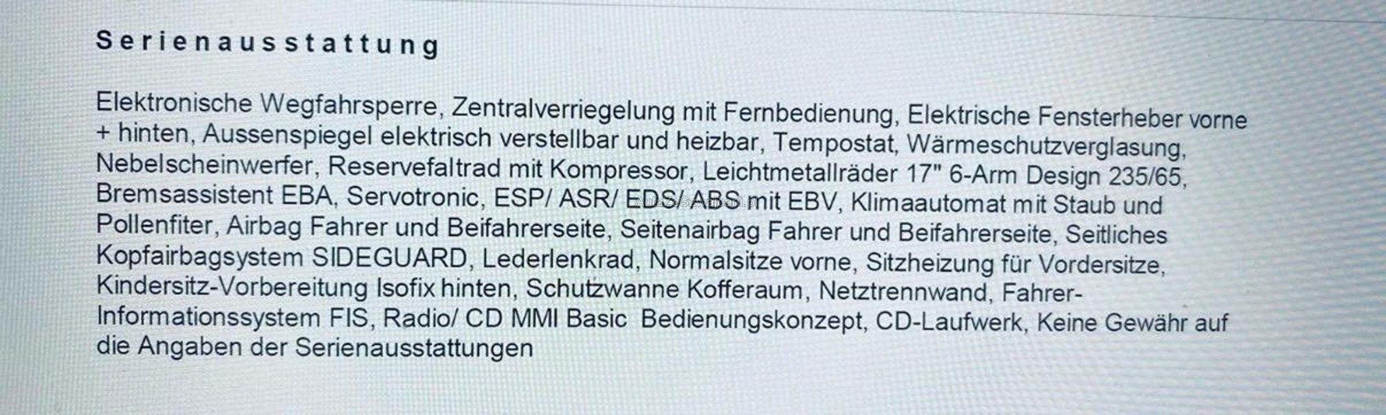 | Kommentar | Aus 1.Hand unfallfrei und keine Nachlackierungen. Servicegepflegt. Ölverbrauchsproblem wurde auf Garantie bei ca. 70'000km behoben. Keine Kratzer oder Beulen. Kaum Steinschläge. 20 Zoll Sommerfelgen mit Pneu. Es wurde kein Werkstatttest gemacht. Jegliche Gewährleistung wird wegbedungen, insbesondere sind Wandelung und Minderung ausgeschlossen. Die Verantwortung liegt beim Käufer. Rückgabe ausgeschlossen. |