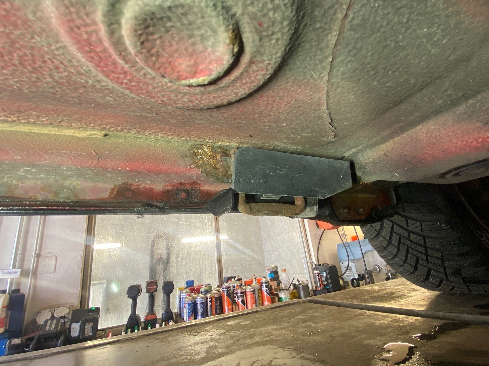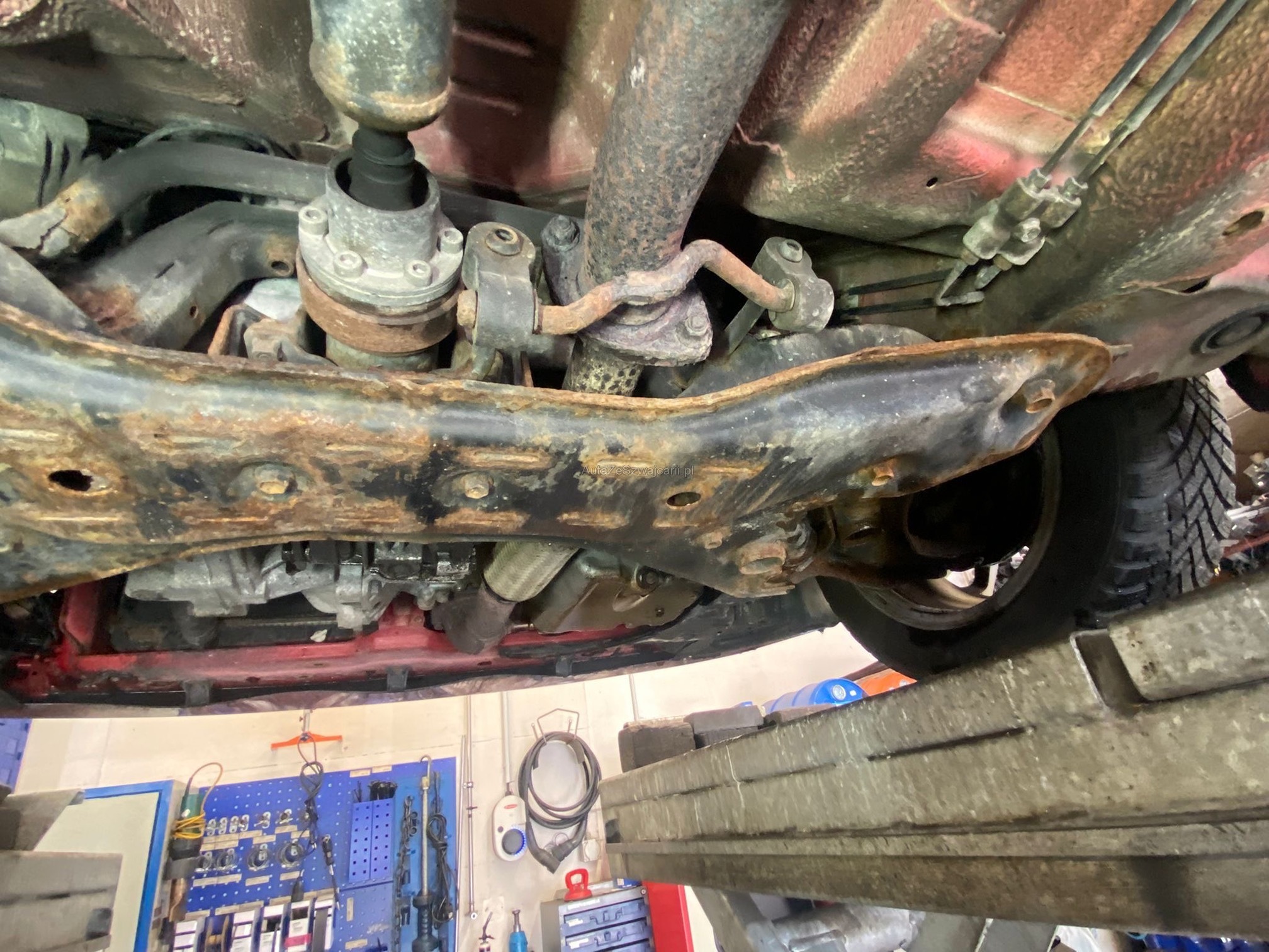 | Kommentar | Motor und Getriebe ist i.O, kein Lärm Bremsen vorne Rost -> ersetzen Scheinwerfer polieren Ölverlust: Oelfilterflansch Zwischen Getriebe und Verteilergetriebe Getriebedeckel links Diff. Hinten Eingang und bei beiden AT Wellen AT Manschetten hinten innen links und rechts gerissen. Koppelstange vorne links spiel Stabigummis innen müssen ersetzt werden Querlenker vo li. und re. Spiel / spröde, ersetzen Heckleuchte links Riss Auspuffverbindung zu Endtopf, Schraube abgerostet Stossstange hinten links gerissen / lose Kupplung zeitweise schwergängig, Funktion noch i.O. Service fällig Zustand gebraucht gemäss Fotos, Mängelliste ohne gewähr. |