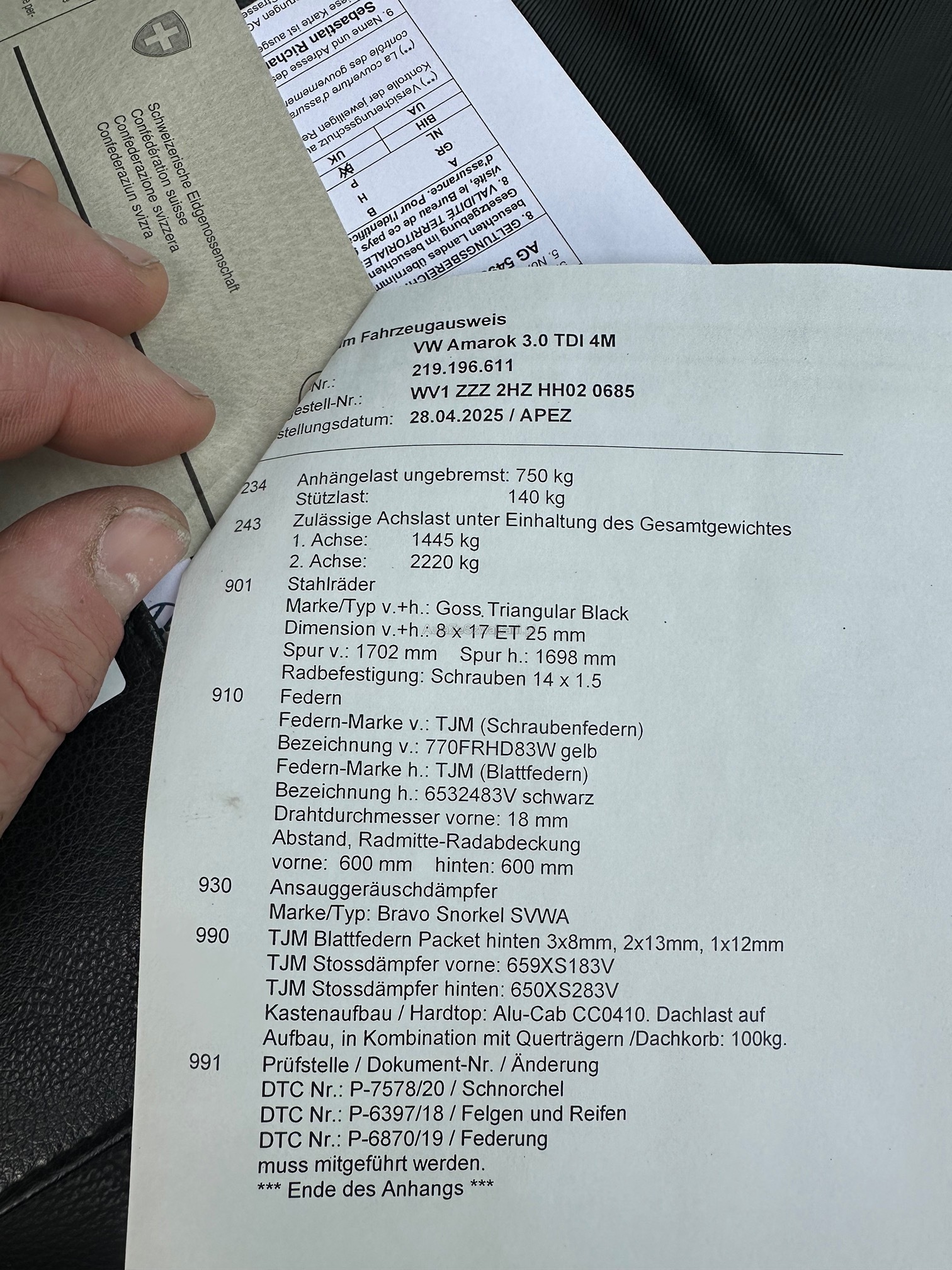 | Kommentar | Fahrzeugdetails: Reise fertiges Weltreisemobil VW Amarok 3.0 TDI Baujahr 2017, jährlicher Service mit Serviceheft 97.000km 165kw / 224PS Auflastung auf 3.5t mit TJM Fahrwerk HD Bergeösen vorne Safari Schnorchel 2 Zoll Aufnahme von VW, original AHK vorhanden Zusatzfernlichter Arbeitsscheinwerfer seitlich und hinten 6x Vredestein Pinza AT 265/70 R17 121/118R (NEU (<5.000km) 6x Falken Wildpeak A/T3WA 265/70 R17 (ca. 20.000km) Ausbau: AluCab Canopy Camper 270 AluCab Markise Reserverradhalter AluCab Dachträger HD Rockslider Versorgungsbatterie (120Ah (von 2025)) mit CTEK Ladegeräten (Smartpass + 250DE) 120W Solarpanel 1000W Inverter für 220V 220V Stromanschluss incl. Ladevorrichtung Engel Kompressorkühlschrank MT-27-F Diesel Standheizung Autoterm Planar 2D Individueller Holzausbau vom Schreiner Ausrüstung: Bergeset inkl. kinetischem Seil, div. Schäkel 12v Mobile Seilwinde (6.800kg) Alucab Vorzelt Wasserkanister und -säcke Gaskocher 2-flammig Kochgeschirr Werkzeug und Material 2x Klappstühle und Tisch 2x Feuerlöscher 2x Maxtraks Bergebretter Schneeketten (hinten) Dieselkanister Diffentlüftungskit (nicht verbaut) Im Kundenauftrag zu verkaufen: Sieh Fahrzeugbeschreib des Kunden! Verkauf ab Platz ohne Garantie und Nachwährschaft. Wandelung und Minderung werden wegbedungen. Fahrzeug ist Mechanisch in einem guten Zustand und er Kunde führt in den nächsten Tagen noch die MFK durch. Service Nachweis bei den Fotos einsehbar. Fahrzeug wurde vergangenen Samstag begutachtet und ist Technisch in einem guten Zustand. Schäden siehe Fotos. Es werden keine Nachverhandlungen geführt auch für Schäden die nicht sichtbar sind oder nicht deklariert wurden. |