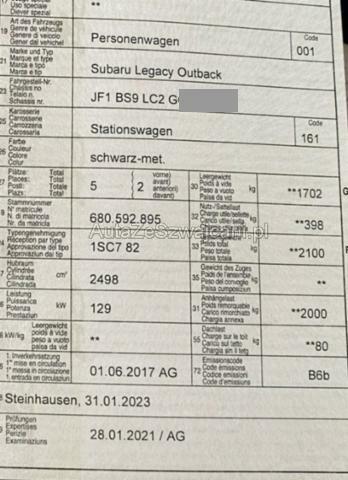 | Condition_and_Equipment | Heck Heckblech eingedrückt. Kofferboden eingedrückt. Heckklappe eingedrückt. Abgasanlage deformiert. Sonstige Schäden Div.Carrosserie Teile sind leicht beschädigt. --- Serienaustattung Airbag Fahrer und Beifahrerseite Sitzheizung vorne Fahrersitz elektrisch verstellbar Beifahrersitz elektrisch verstellbar Elektrische Fensterheber vorne + hinten Tempomat Leichtmetallfelgen Dachreling Seitenairbag Fahrer und Beifahrerseite Zentralverriegelung mit Fernbedienung Glasschiebedach elektrisch Lederlenkrad Kopfairbag vorne und hinten Reifendruck-Kontrollsystem RDK Lendenwirbelstütze Fahrersitz Lederschaltknauf Aussenspiegel elektrisch verstellbar/ heizbar und anklappbar Fahrersitz mit Memory Rücksitze geteilt umklappbar 60/40 Isofix-Kindersitzbefestigung ABS und EBV Elektr. Bremskraftverteilung inkl. BA Servolenkung elektrisch Rückfahrkamera Elektronische Fahrdynamik-Regelung Regen- und Lichtsensor Knieairbag Fahrer Keyless Schliess- und Startsystem Frontspoiler mit integrierten Nebellampen Heckklappe elektrisch Radio/ CD/ MP3/ DAB Touchscreen-Bildschirm Anschluss USB und AUX Fernbedienung am Lenkrad Stop + Start System LED-Scheinwerfer Abgedunkelte Scheiben Bluetooth Freisprechanlage mit Spracherkennung Keine Gewähr auf die Angaben der Serienausstattungen Klimaanlage automatisch 2-Zonen Navigationssystem DAB+ Pack Advanced Safety Pack Fahrerassistenz Eyesight Sonderausstattung Metallic-Lackierung Park-Distanz-Sensor vorne + hinten Anhängerkupplung abnehmbar LED Tagfahrlicht Aussenspiegel einklappbar Heckklappe elektrisch mit Freihandfunktion Pack Edizione Tabacco Stile |